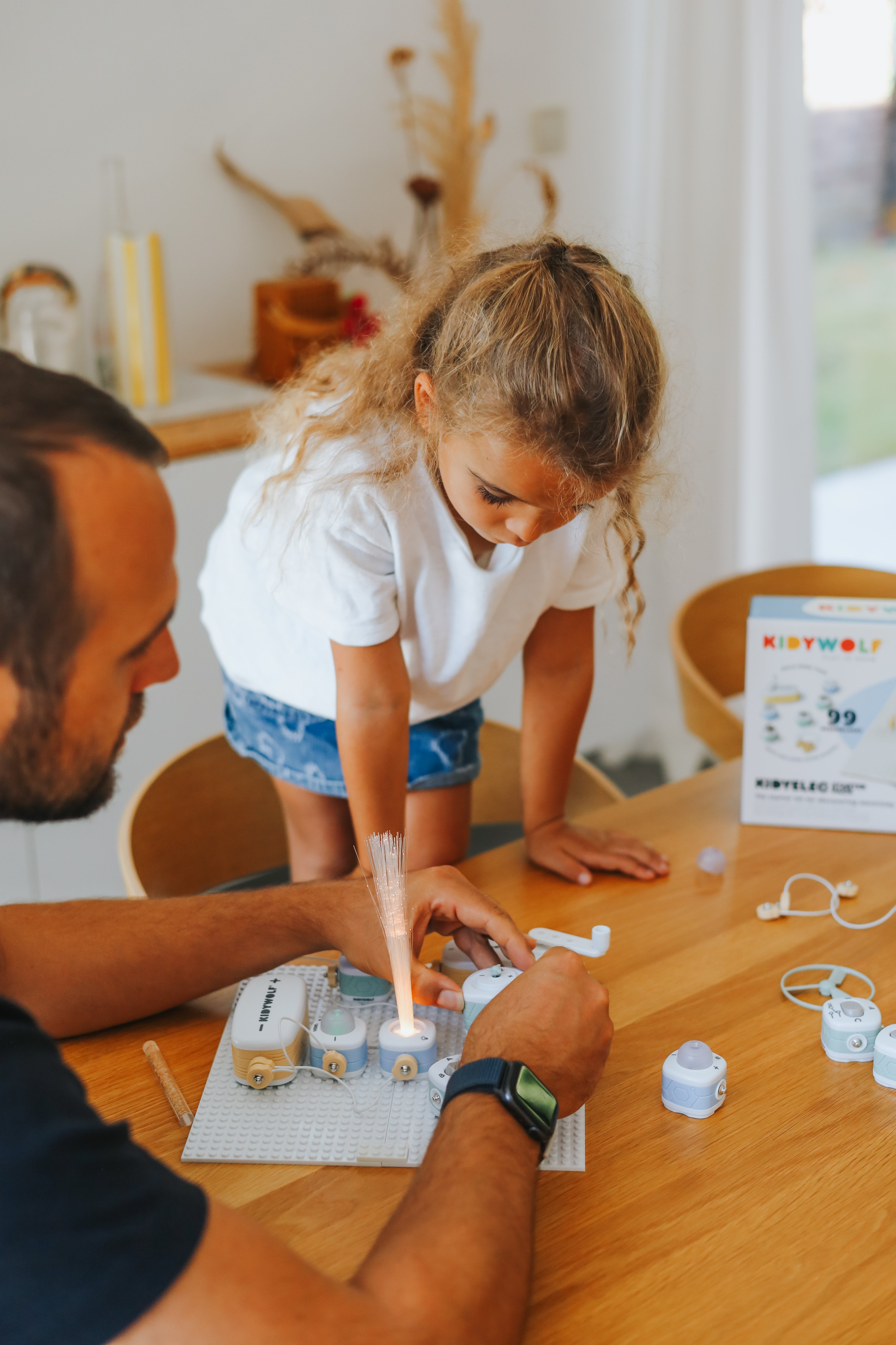 De KIDYELEC van Kidywolf is een prachtige educatieve set waarmee kinderen ontdekken hoe elektrische circuits werken, volledig veilig en op hun niveau. Je hebt twee versies: de Starter‑set (≈ 11 onderdelen) voor kinderen vanaf zo’n 6 jaar, en de Expert‑set (≈ 18 onderdelen) voor kinderen vanaf 8 jaar. Samen met mama en papa kan deze laatste set ook al jonger gebruikt worden.