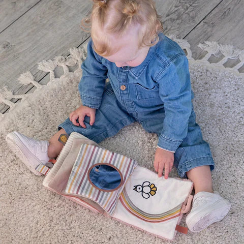 Om de zintuigen van je mini te prikkelen is een activiteitenboekje ook echt geweldig. Little Dutch heeft wondermooie en kleurrijke boekjes met activiteiten zoals een rammelaar, knisper en een spiegeltje. Er zijn ook verschillende labels waar je kindje aan kan voelen. Ook is dit goed voor de ontwikkeling van de hand-oogcoördinatie. (Vanaf €17,95)