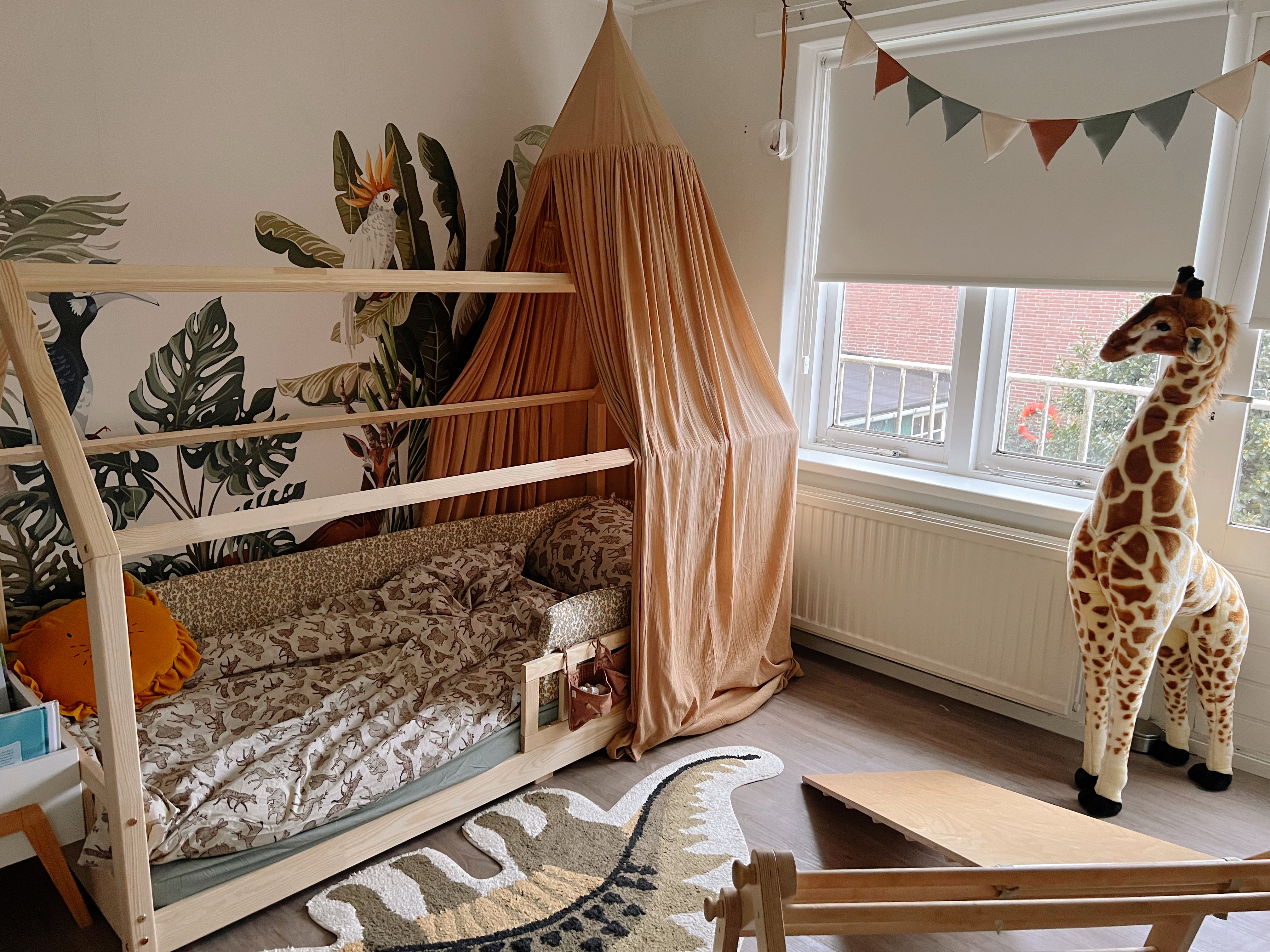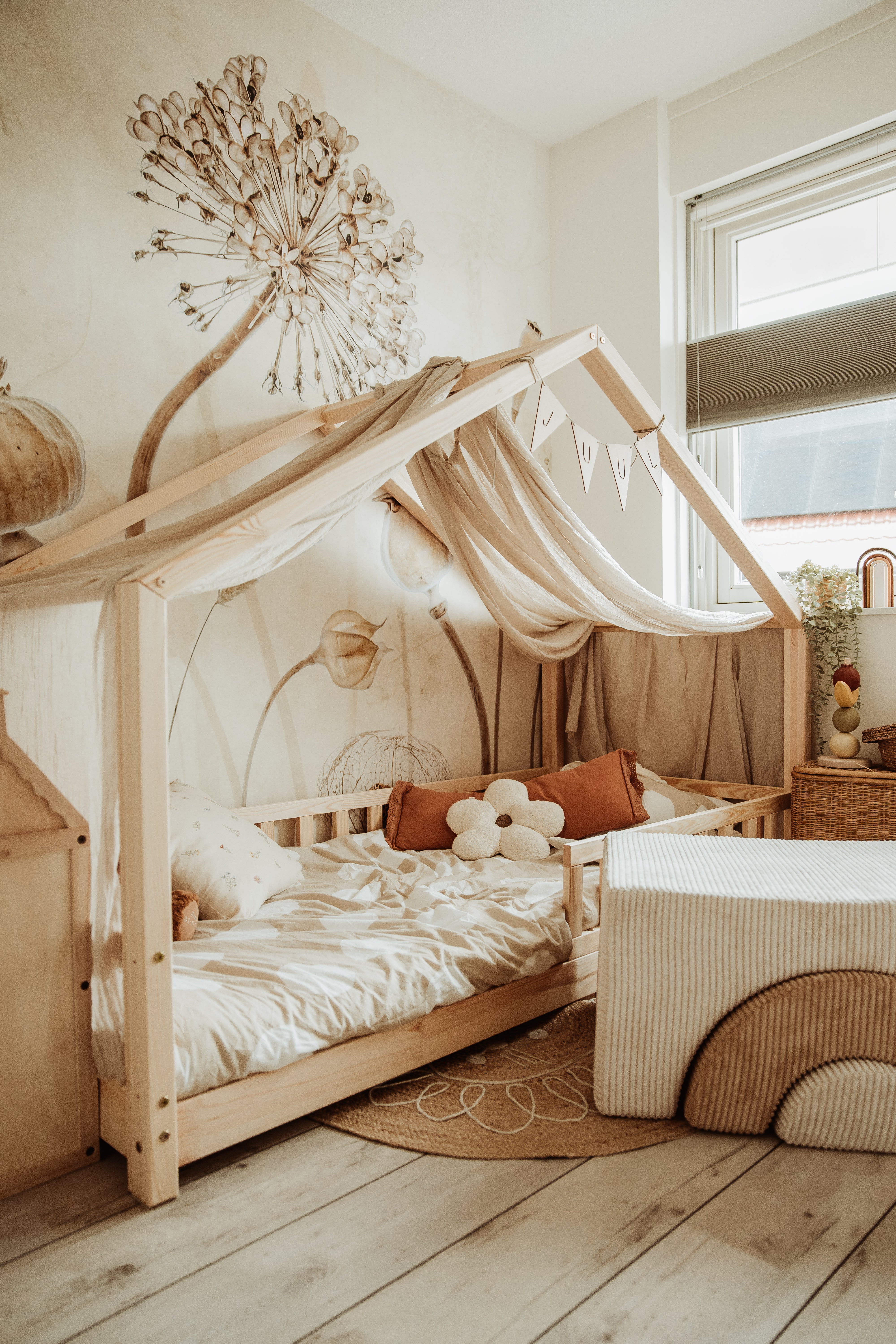 Het Gele Flamingo bedhuisje is een vloerbed. Een vloerbed is een matras laag op de grond, waar je kindje op slaapt. Zo kan je kindje makkelijk in en uit bed. Een vloerbed is eigenlijk ontstaan vanuit de Montessori methode. De basis hiervan is "help mij om het zelf te doen". Je kindje kan zelf kiezen om te gaan liggen, slapen, kijken of in en uit bed te kruipen. Zo respecteer je de keuzes van je kiddo en daar draait het Montessori principe rond. Je legt hen geen bepaalde onbewuste keuzes op en laat je Flamingo zelf ontdekken.