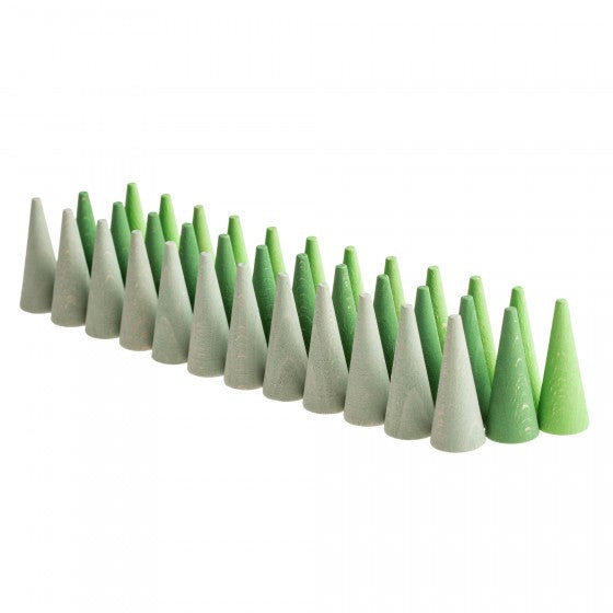 Deze houten speelset bestaat uit 36 houten kegels in verschillende tinten groen. Met een klein beetje fantasie zijn het boompjes, maar het kan veel meer zijn dan dat. Leuk om te combineren met ander Grapat speelgoed om zo fantasiewerelden te creëren. of mandala's en patronen te maken. Dit prikkelt de fantasie en stimuleert de creativiteit.