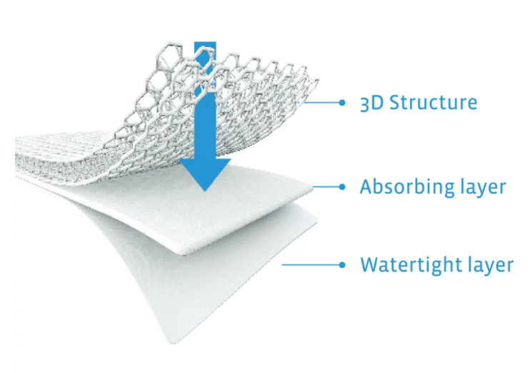 De 3D luchtlaag zorgt voor vrij ademen en afvoeren van overtollige warmte. Naast goed ademen en een veilige temperatuur ligt je kindje ook altijd droog. Alle vocht gaat door de 3D structuur heen naar de absorberende laag. Hiermee worden vroegtijdig wakker worden en huidirritaties voorkomen. Tenslotte blijft de matras droog, schoon en vrij van bacteriën en allergenen dankzij de beschermende laag.