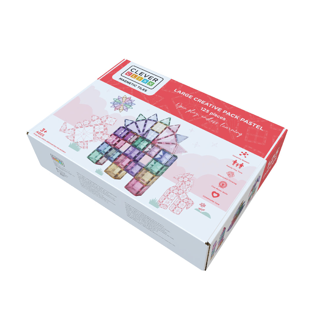 Eindeloos grenzeloos bouwplezier met dit 125-delige Large Creative Pack van Cleverclixx. Met deze leuke pastel set gaat je kindje aan de slag en leert hij of zij verschillende vormen in verschillende kleuren kennen. Het is een perfecte set om met het gezin samen te bouwen én meteen ook grotere bouwcreaties te maken.