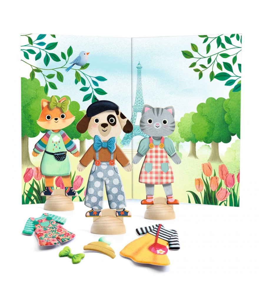 Leuke knutselactiviteit met deze set van Djeco. Kleed de drie houten personages aan met keuze uit meer dan 45 kledingstukken die je kan plakken en er weer af kan halen. Verzin de mooiste verhalen met deze drie decors.