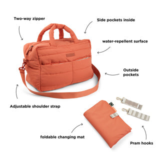 De zacht gewatteerde luiertas en het verschoningsmatje zijn ontworpen in een mooie zandkleur. Met de riempjes aan de buitenkant kun je de tas gemakkelijk aan de kinderwagen bevestigen. Het oppervlaktemateriaal is gemakkelijk schoon te vegen met een vochtige doek.
