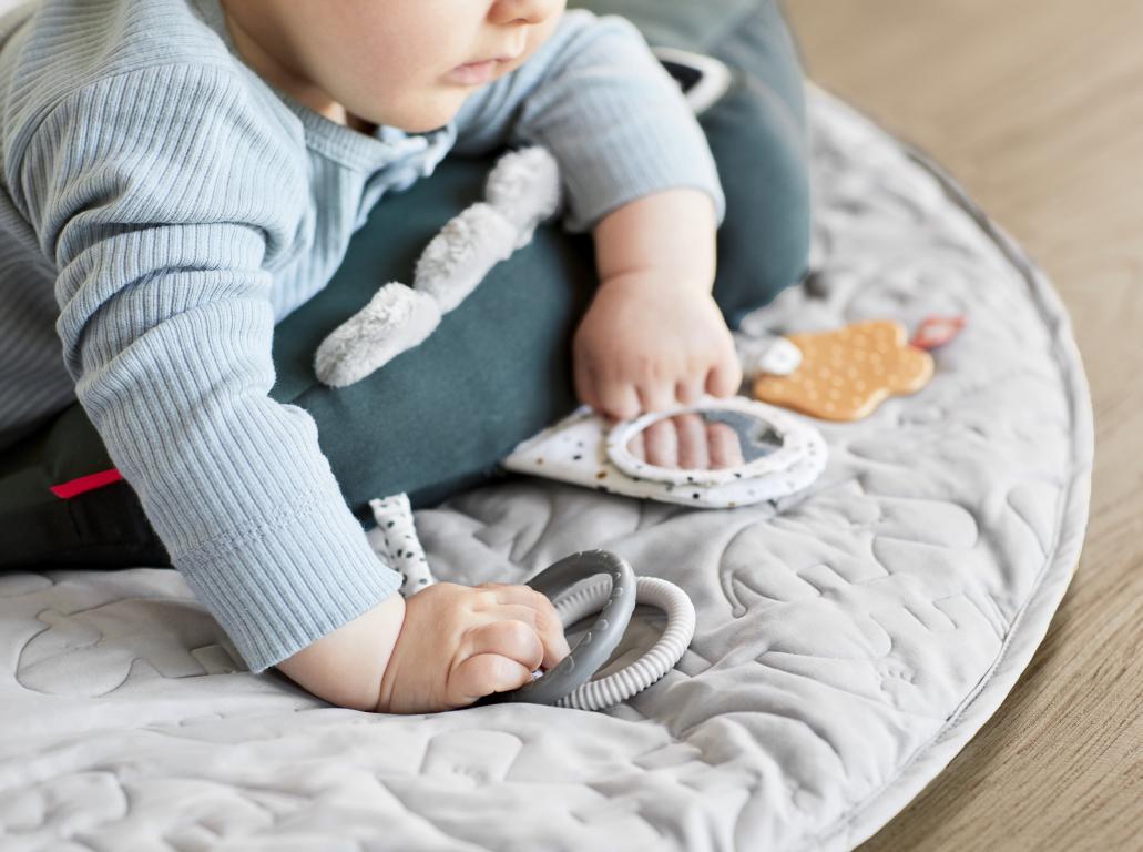 Stimuleer de nek en het hoofdje van je kindje. Het speeltje heeft verschillende activiteiten voor je baby om te voelen en om naar te kijken.