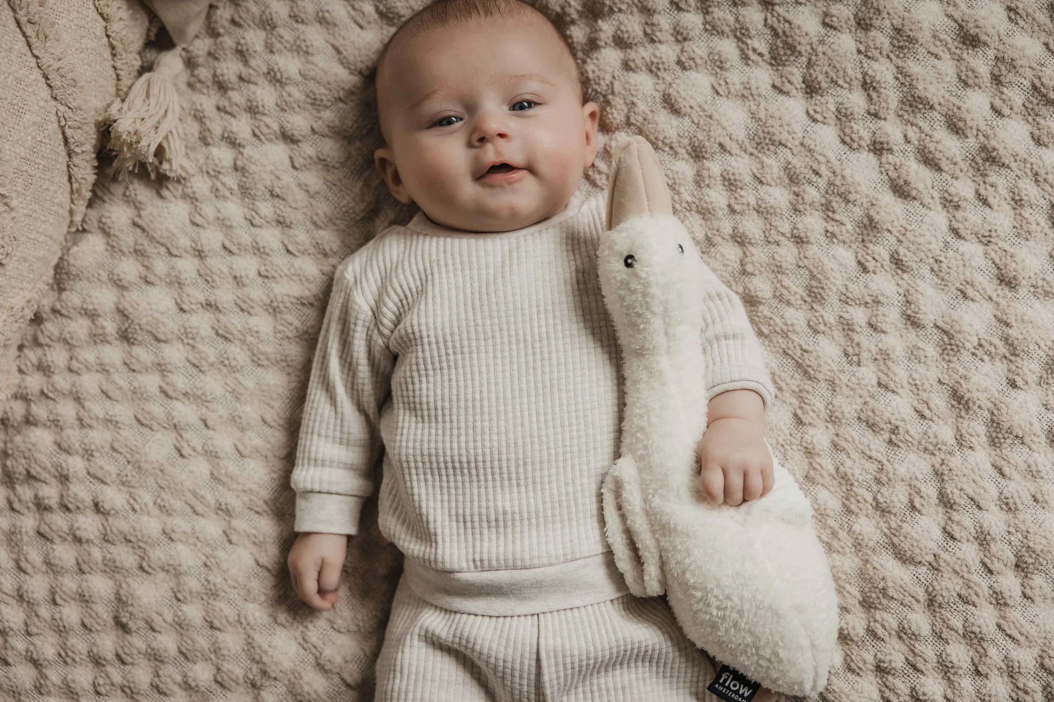 De Flow Amsterdam Liva Hartslagknuffel in bruin helpt jouw baby comfortabel in slaap te vallen en langer door te slapen. Deze zachte knuffel speelt rustgevende geluiden zoals een hartslag, witte ruis, ademhaling, regengeluid en een melodie die je baby kalmeert. Dankzij de ingebouwde huilsensor gaat het muziekdoosje automatisch aan wanneer je kindje huilt, zodat je baby snel weer tot rust komt.