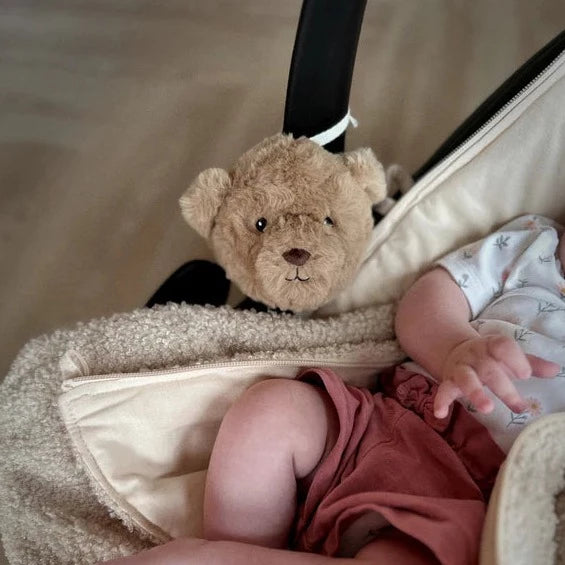 Je bevestigt het berenhoofdje makkelijk aan je Maxi Cosi of kinderwagen met het touwtje. Met een knop kun je het muziekdoosje aanzetten, het volume aanpassen en het geluid kiezen. Omdat de knop extra groot is, is hij makkelijk te bedienen, zelfs als hij in de knuffel zit.