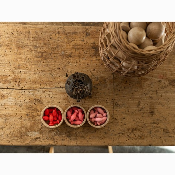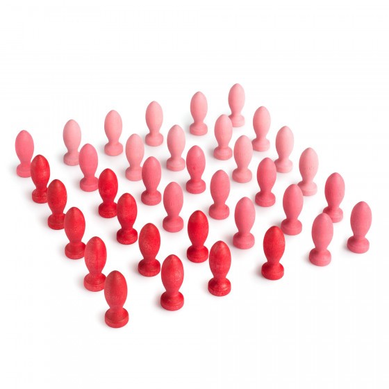Deze houten speelset bestaat uit 36 houten "bloemblaadjes" in verschillende tinten rood en roze. Het heet "flower petals" maar het zouden net zo goed vlammen, poppetjes of kaarsjes kunnen zijn. Of wat dan ook, want verbeelding is nu eenmaal eindeloos. Leuk om te combineren met ander Grapat speelgoed om zo fantasiewerelden te creëren of mandala's en patronen te maken. Dit prikkelt de fantasie en stimuleert de creativiteit.