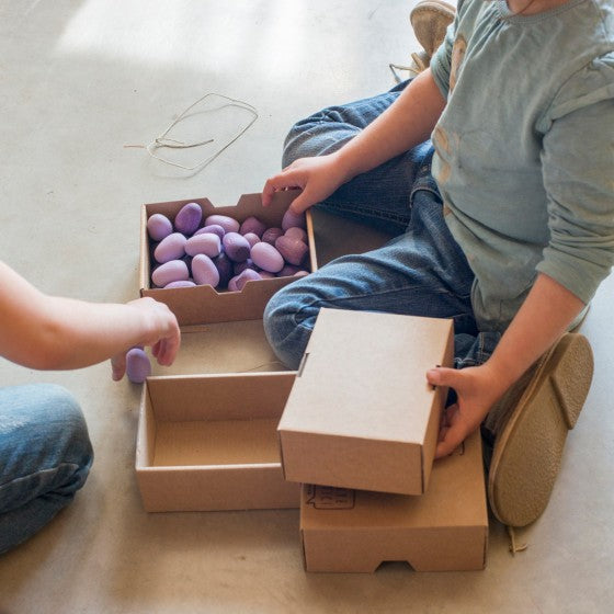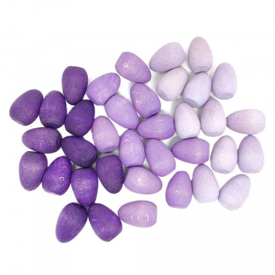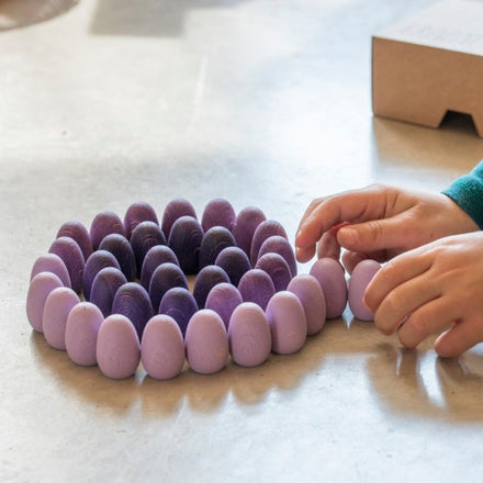 Deze houten speelset bestaat uit 36 houten eitjes in verschillende tinten paars en lila. De eitjes zijn 35 mm hoog. Leuk om te combineren met ander Grapat speelgoed om zo fantasiewerelden te creëren. Of om mandala's en patronen te maken. Dit prikkelt de fantasie en stimuleert de creativiteit.