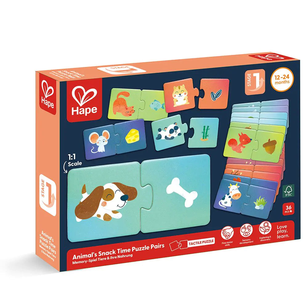 Leuke kleurrijke en educatieve puzzelset van Hape. Laat je kinderen kennis maken met verschillende dieren en hun favoriete voeding!