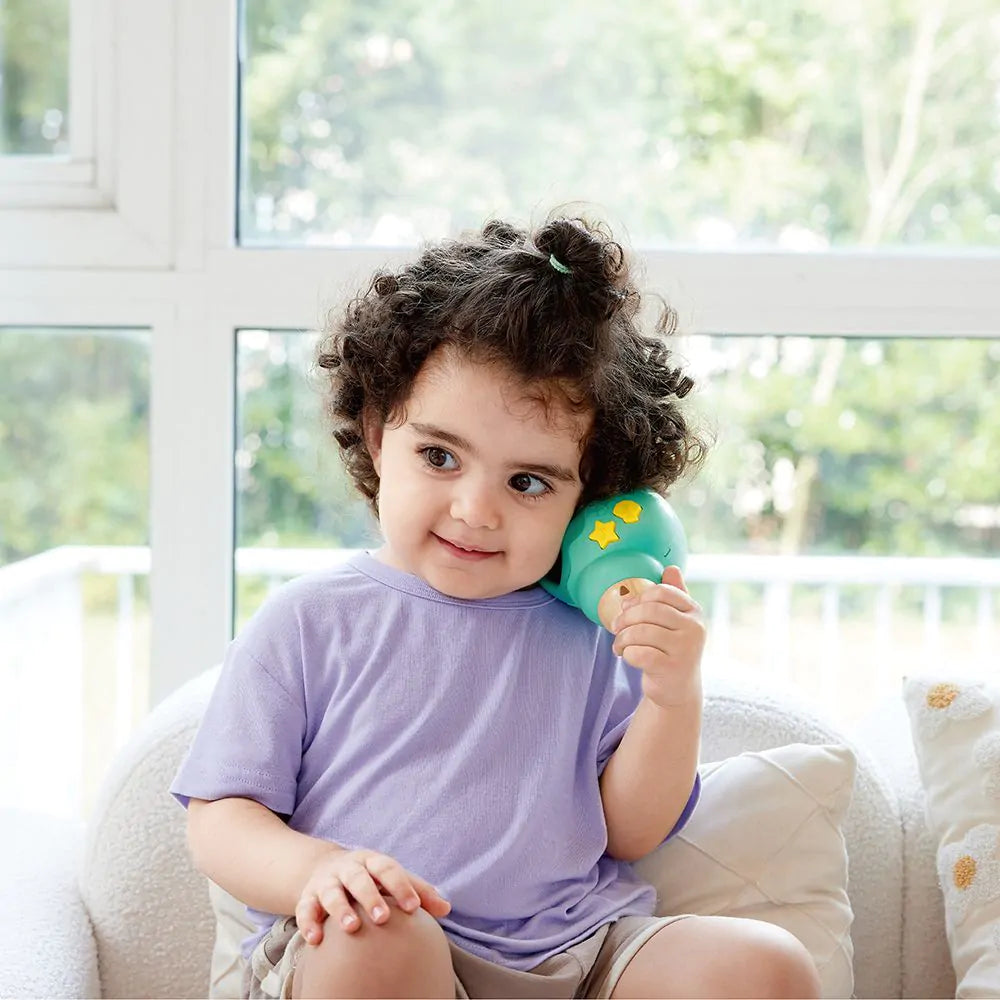 Muziek en geluiden: Druk op de sterknop om te genieten van vijf voorgeprogrammeerde melodieën. Houd de schelpknop ingedrukt om eigen stemopnames te maken. Door de basis van de schelp te draaien, kunnen kinderen de geluiden transformeren naar speelse varianten zoals robotachtige stemmen, oceaangolven of bubbels.