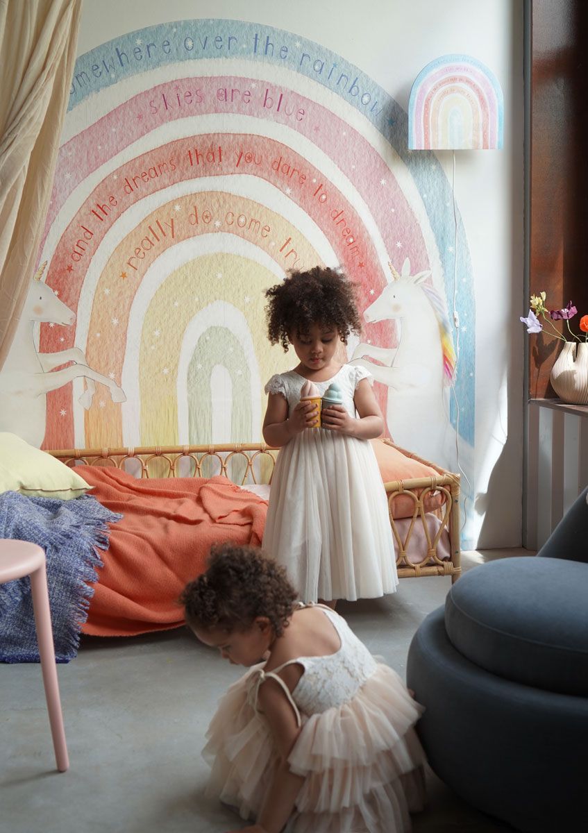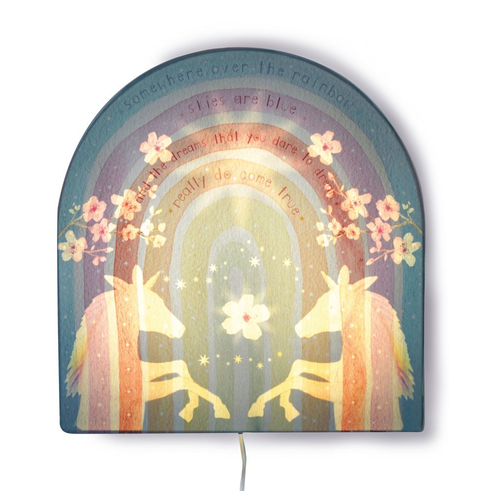 Wie kent het liedje "Somewhere over the Rainbow" niet? Deze prachtige woorden zijn in de kleuren van onze Regenboog wandlamp verweven. Als je het licht aandoet verschijnen twee lieve Eenhoorns die tussen de bloemen dansen. Dans je mee?