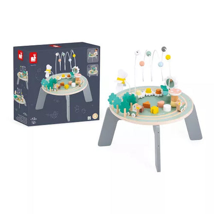 De houten activiteitentafel van het Franse merk Janod is vervaardigd van hout en bestaat uit acht verschillende spellen. De spellen zijn stuk voor stuk ontworpen om diverse motorische vaardigheden te prikkelen. Elke zijde heeft een andere activiteit; draaien, voelen, duwen... De speelbox is geschikt voor kinderen vanaf 12 maanden.