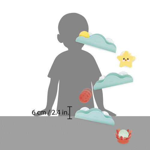In bad gaan wordt nog leuker met dit zeebadcircuit van Janod. Geschikt voor kindjes vanaf 12 maanden. Leuk in bad of in de douche waarbij je een verticaal parcours kan maken waarbij de ballen recht naar beneden rollen.