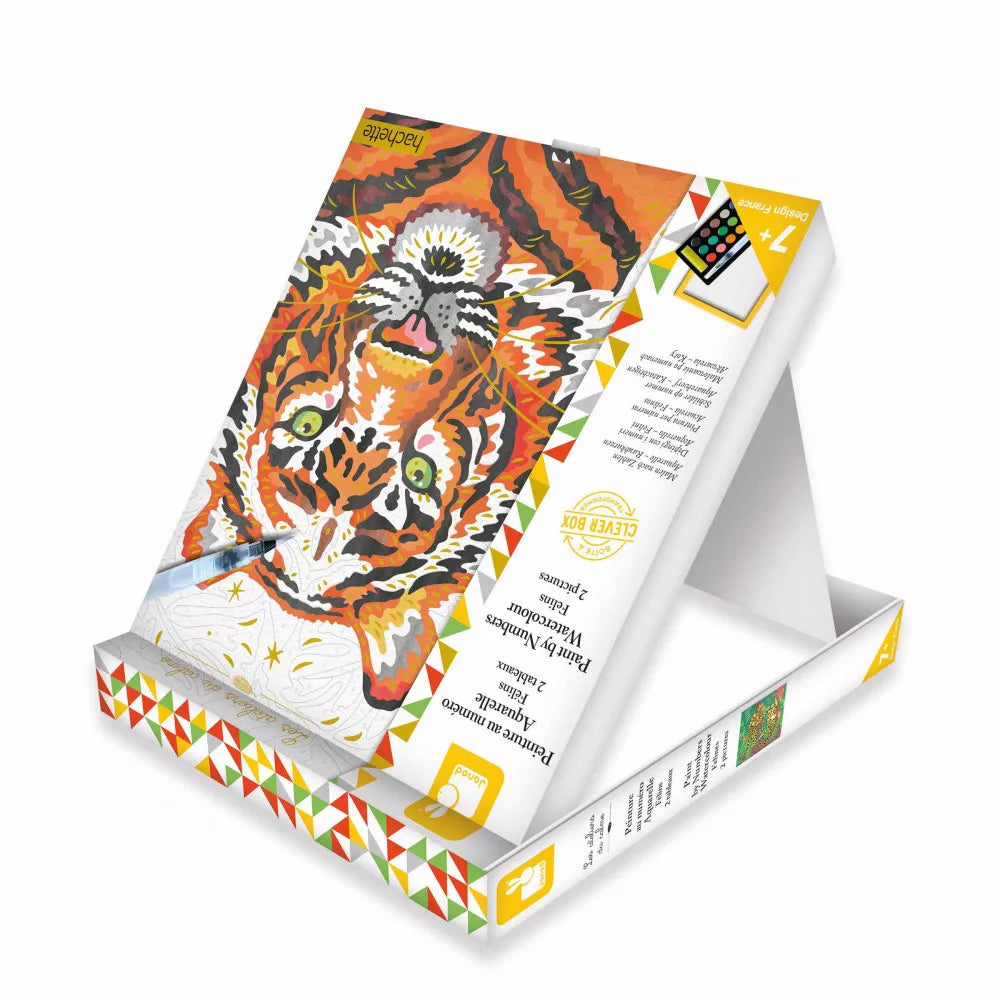 In de doos zitten 2 prachtige schilderijen om te versieren met waterverf. Het eerste schilderij toont een majestueuze tijger en het tweede een luipaard en zijn welp. Er is ook een kader dat beschilderd kan worden om het te personaliseren en aan te passen aan de schilderijen.