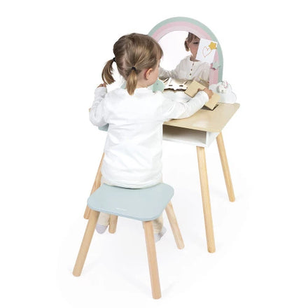 Het leukste houten speelgoed in huis van Janod. Deze leuke make-up tafel wordt geleverd met 10 accessoires: 1 haarborstel, 1 toverstaf, 3 accessories voor een fotohokje en 4 magneten in de vorm van een ster of een eenhoorn.