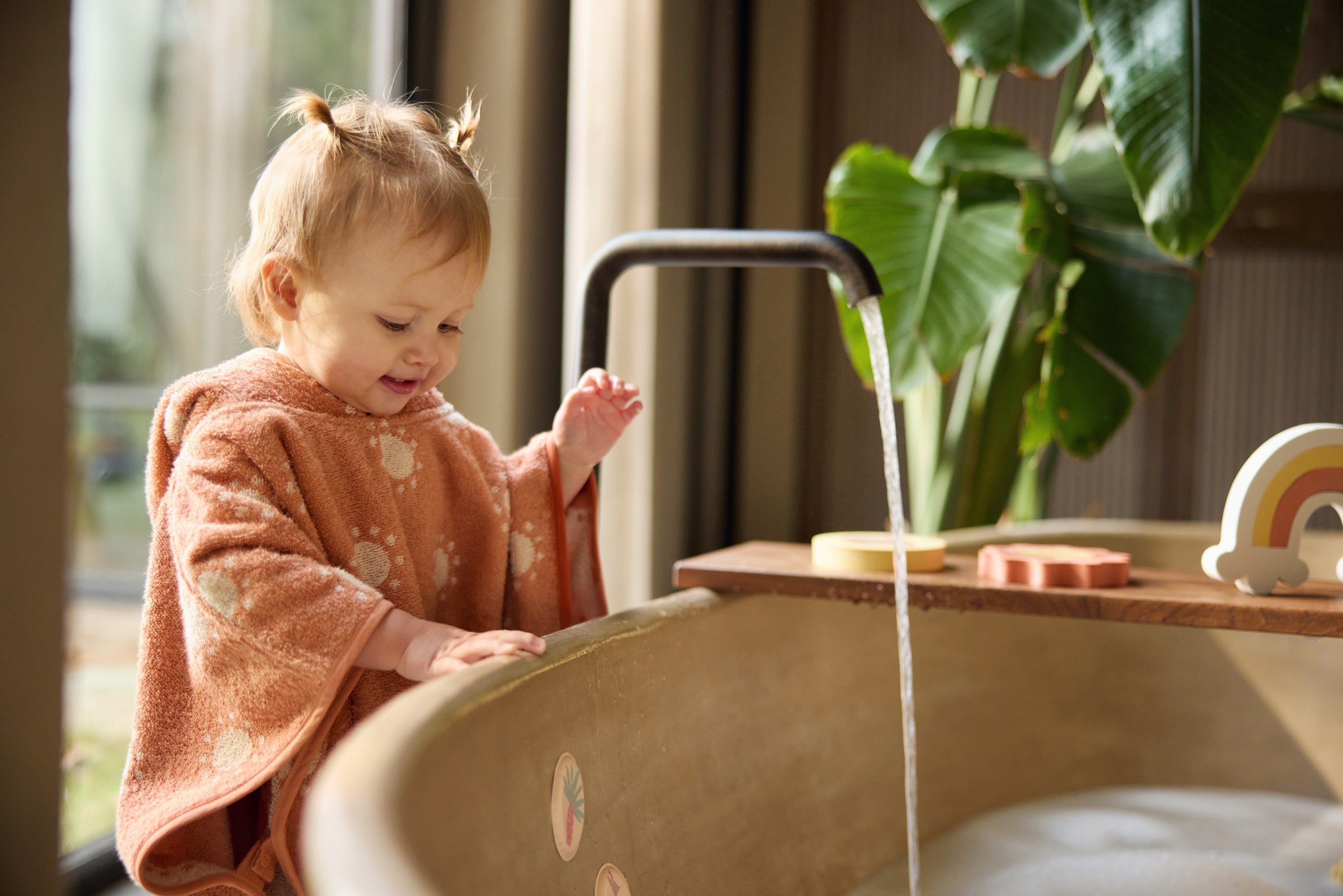 Dankzij het drukknoopje aan de zijkant blijft de poncho goed zitten, óók wanneer je kindje rondloopt of speelt. Praktisch voor thuis, maar net zo fijn om mee te nemen naar het strand of zwembad — altijd klaar voor een warm en knus moment.