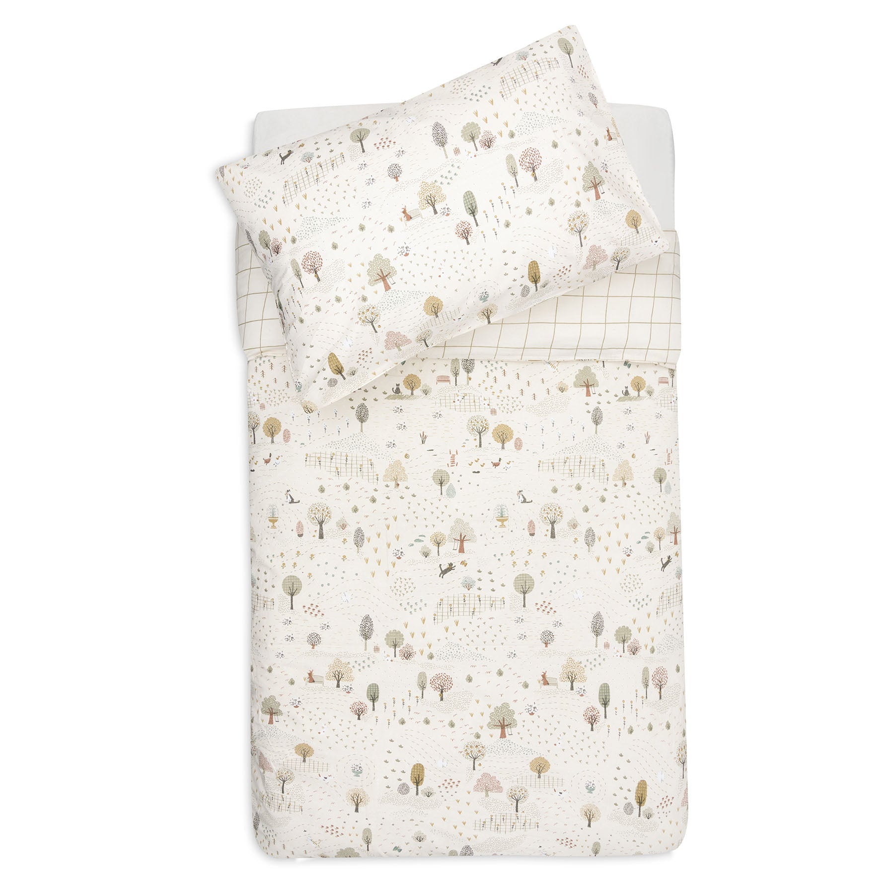Tover het peuterbedje om tot een knus droomplekje met dit schattige dekbedovertrek. De bovenkant is versierd met een vrolijke all-over print, terwijl de achterkant een stijlvol patroon heeft in zachte tinten.