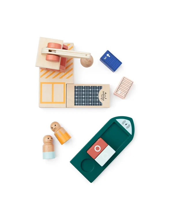De set bevat verschillende houten containers en een kraan, waardoor kinderen de kans krijgen om hun eigen havenavonturen te creëren. Ze kunnen containers laden en lossen, schepen besturen en de logistiek van de haven beheren. Het is een geweldige manier om hun creativiteit en probleemoplossend vermogen te ontwikkelen.