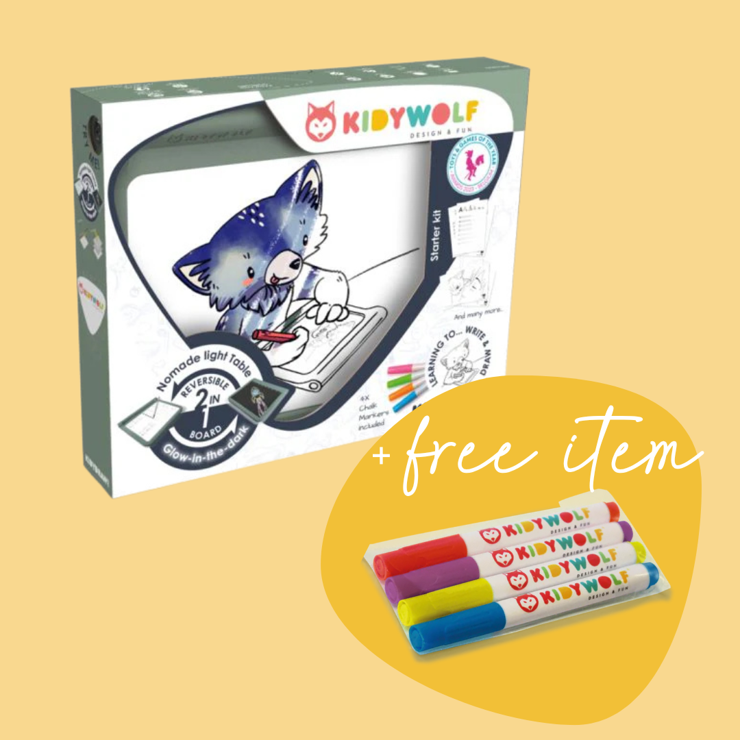 Ontvang nu tijdelijk een GRATIS set kidymarkers bij aankoop van de groene Kidywolf Kidydraw.