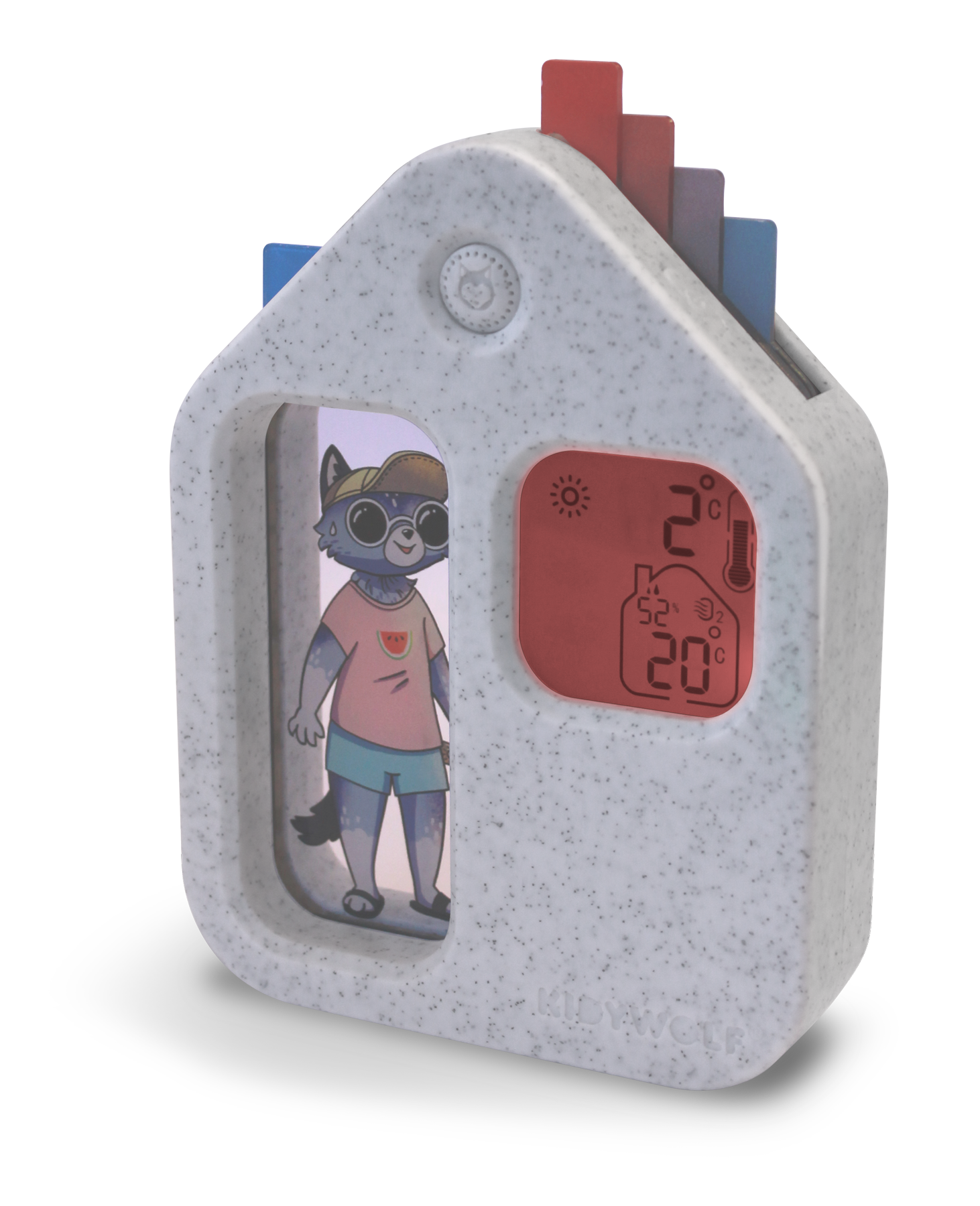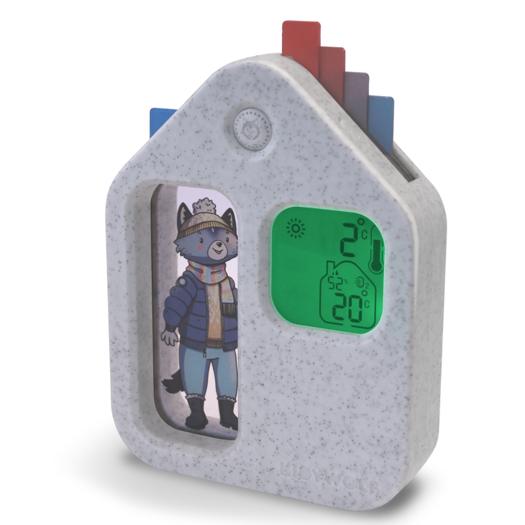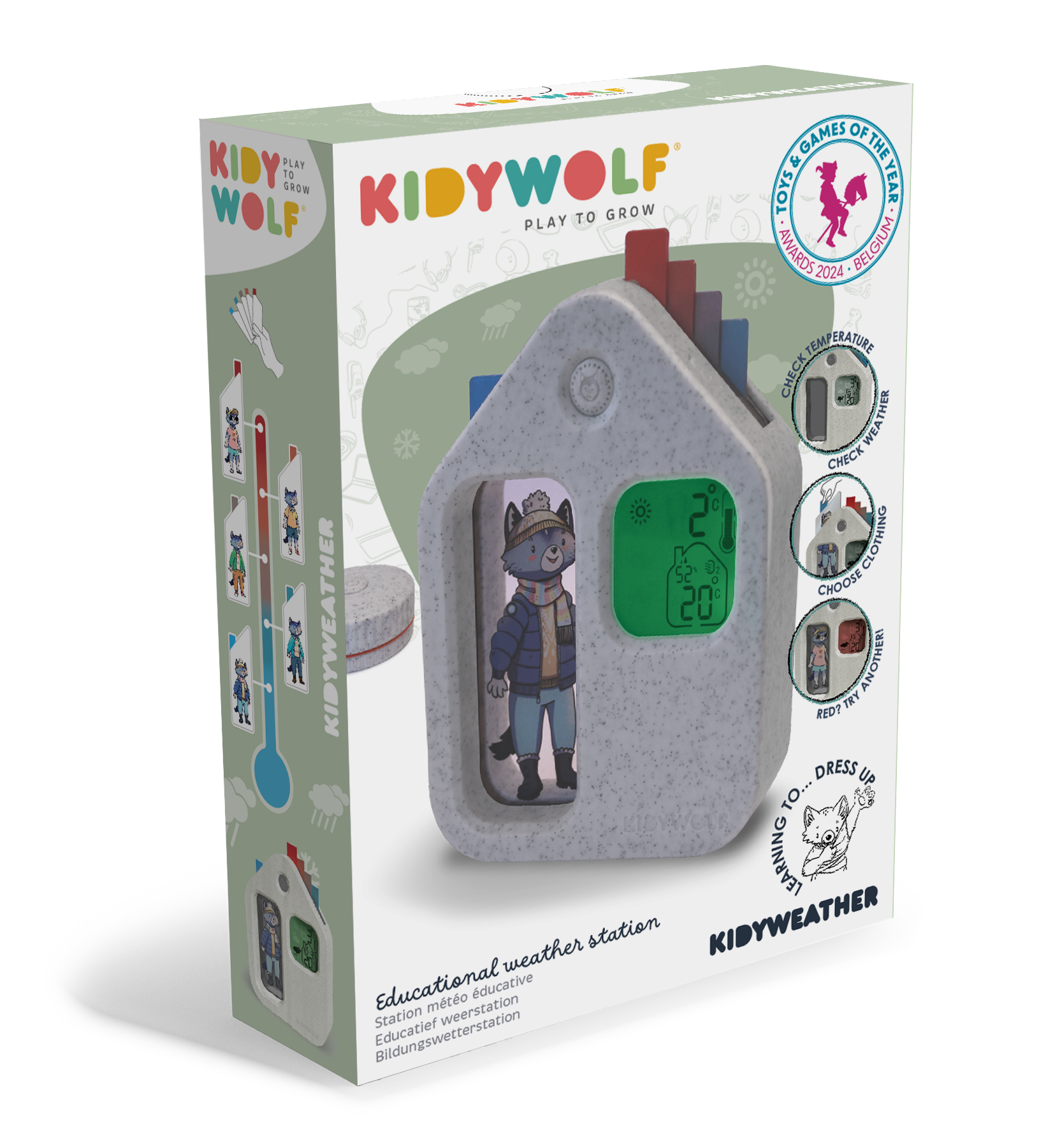 Superleuk en educatief weerstationnetje van Kidywolf. Je kindje kan vanaf nu zelf 's ochtends kijken wat het weer wordt om te kiezen welke kleertjes hij of zij aan kan doen. Het weerstation is ook verbonden met vijf afbeeldingen die totnen welke outfit je kan aandoen.