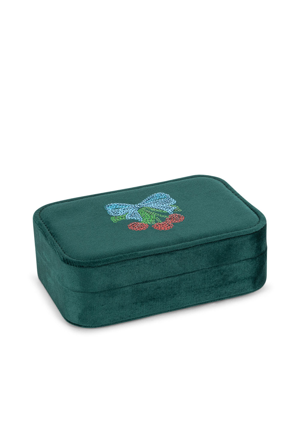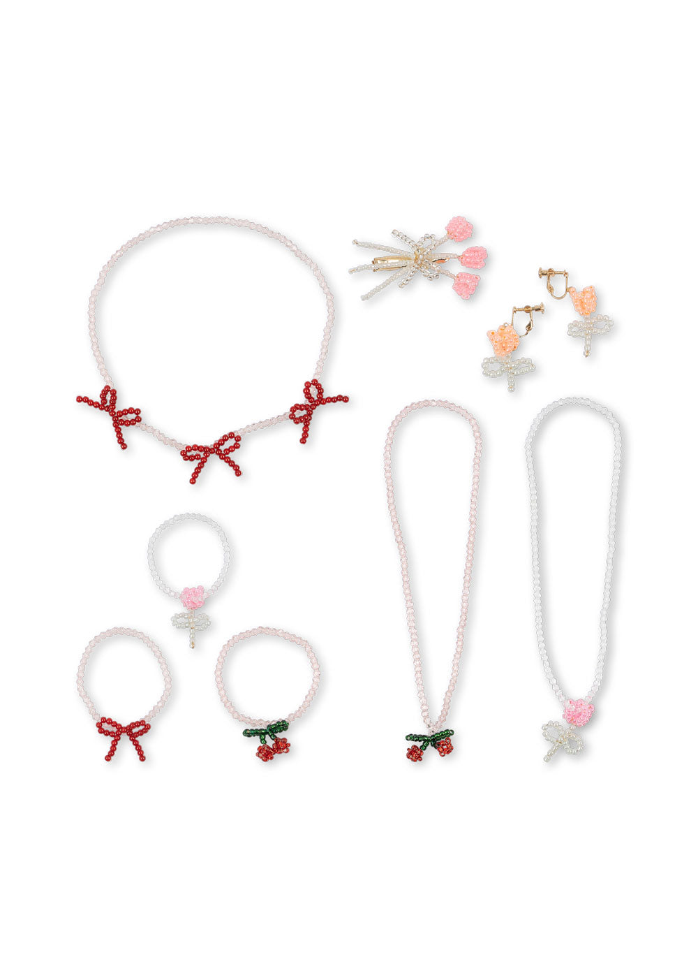 Lief fluwelen sieradendoosje met alle parelmoeren sieraden waar je maar van kunt dromen. Alle armbanden en kettingen zijn elastisch en geschikt voor iedereen.