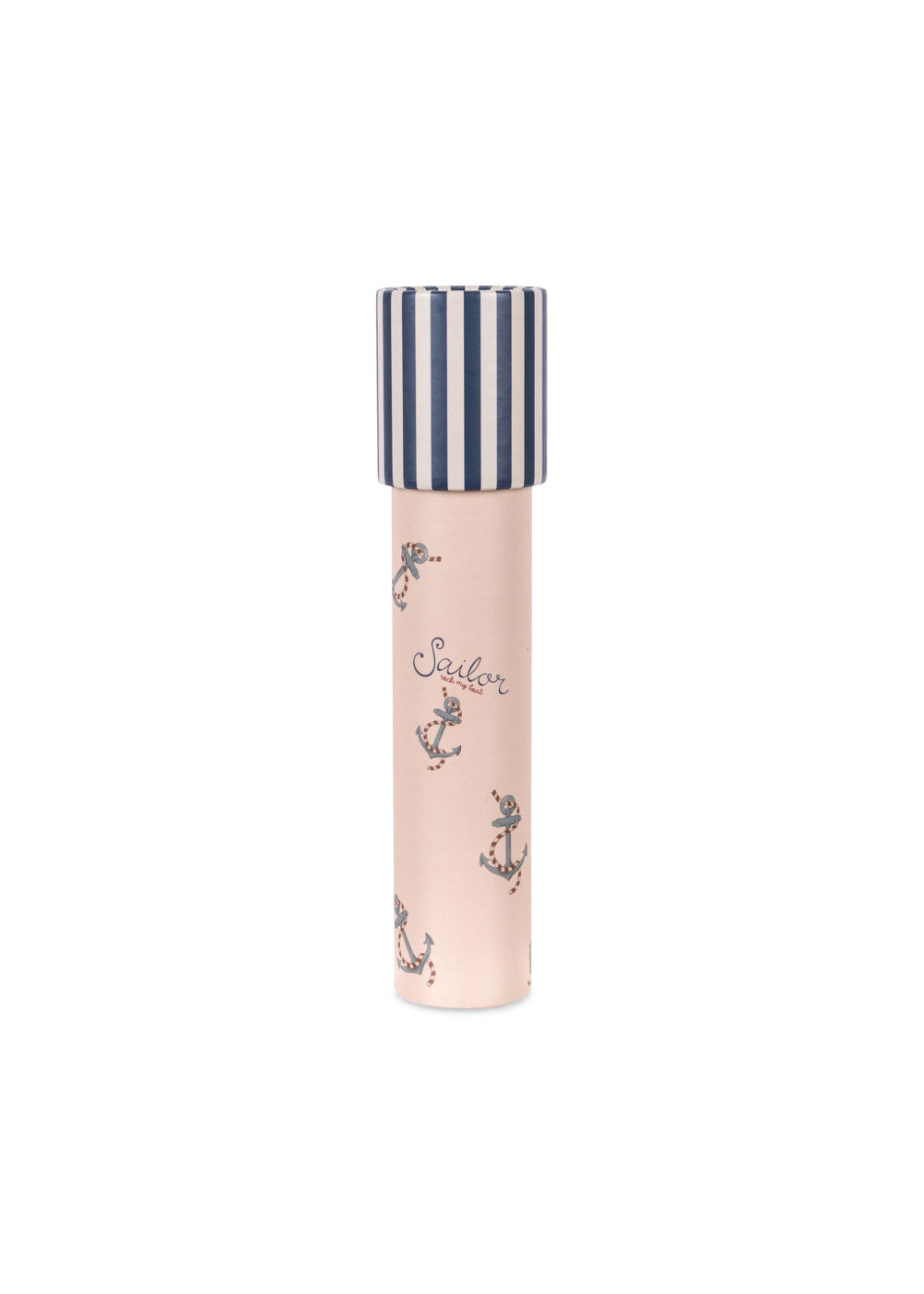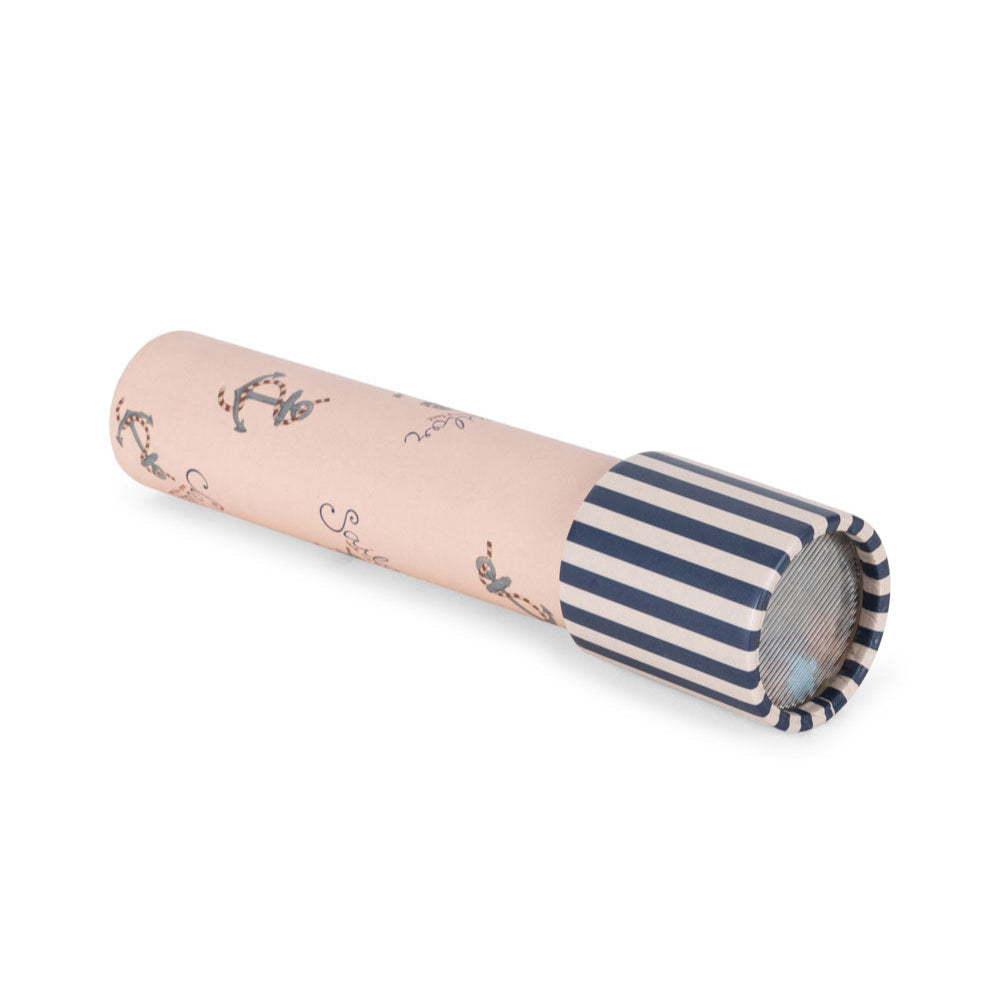 Een caleidoscoop met parels langs de binnenkant. Kijk door de caleidoscoop en geniet van de verschillende kleuren en patronen.