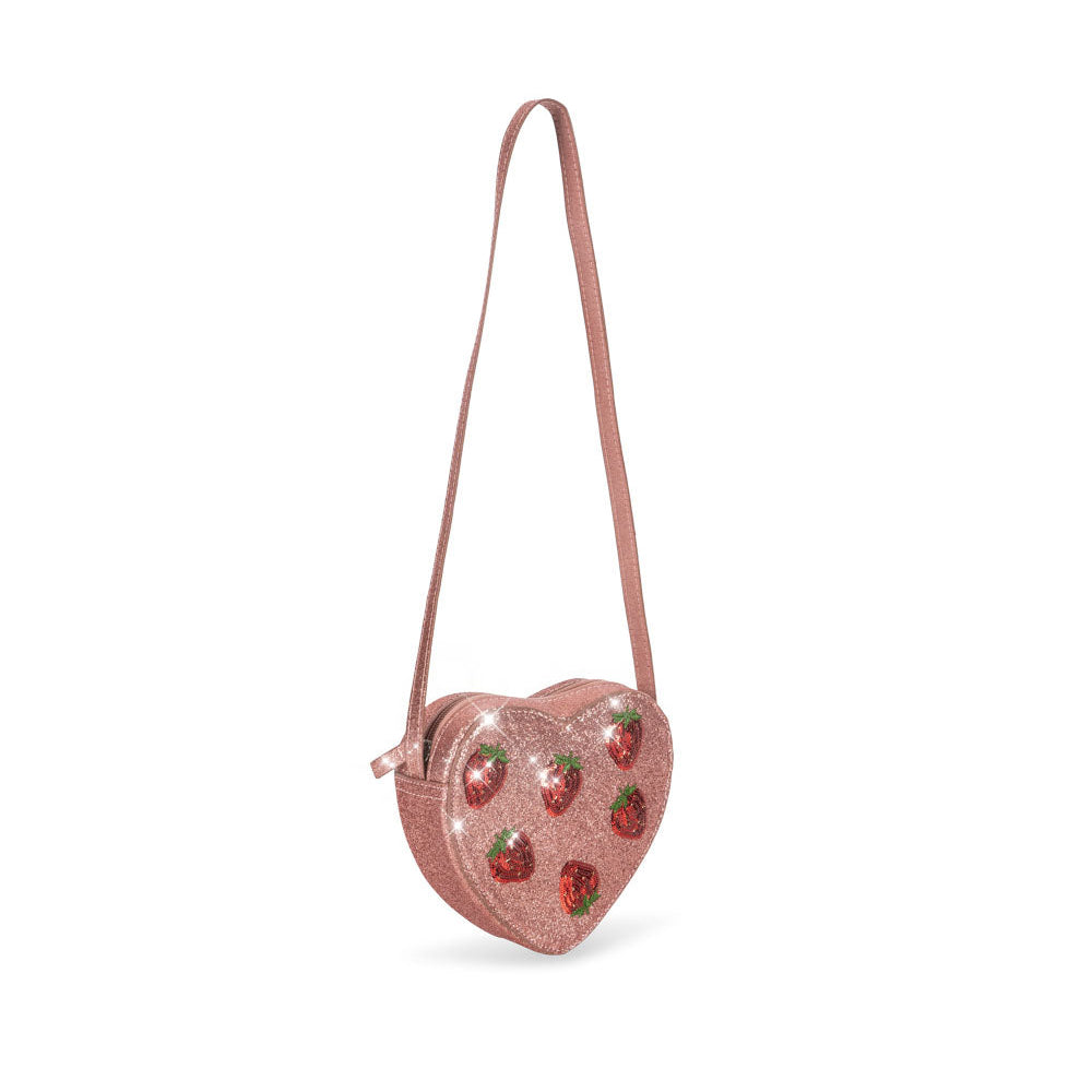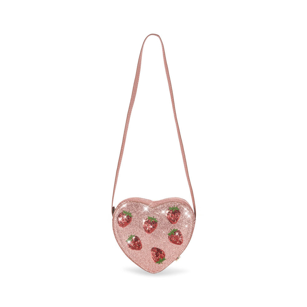 Hartvormige schoudertas met glitter en aardbeiprint.