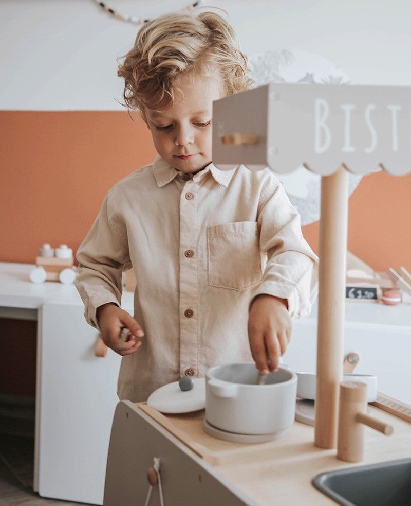De Houten Bistrokeuken is gemaakt met oog voor detail en hoogwaardige materialen, wat resulteert in een duurzaam en esthetisch aantrekkelijk speelstuk voor jouw kind vanaf 3 jaar. De realistische ontwerpelementen, zoals draaibare knoppen, een gootsteen met draaibare kraan en een kookplaat met beweegbare kookpitten, dragen bij aan een meeslepende spelervaring voor jonge chef-koks.