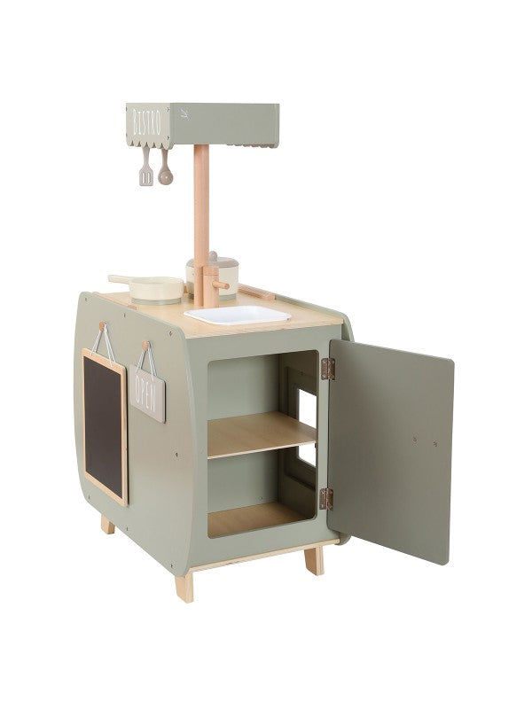 De Houten Bistrokeuken is gemaakt met oog voor detail en hoogwaardige materialen, wat resulteert in een duurzaam en esthetisch aantrekkelijk speelstuk voor jouw kind vanaf 3 jaar. De realistische ontwerpelementen, zoals draaibare knoppen, een gootsteen met draaibare kraan en een kookplaat met beweegbare kookpitten, dragen bij aan een meeslepende spelervaring voor jonge chef-koks.
