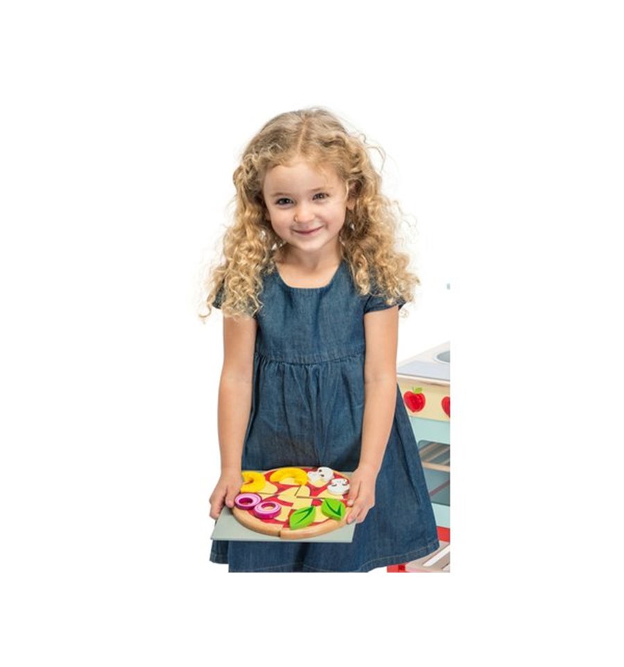 Heerlijk houten pizza van Le Toy Van. Maak je eigen pizza! Een leuke houten pizza met klittenband verwijderbare toppings in een 'pizzadoos'. Bevat een pizzasnijder + bakplaat. De bakplaat past in in de LE TOY VAN-ovens.