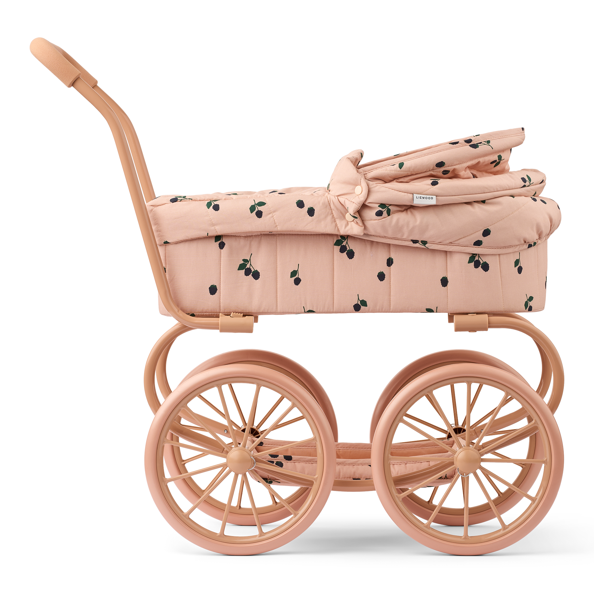 De poppenwagen heeft een stevig metalen frame, zachte wielen die soepel rollen en een afneembare kap van biologisch katoen. Dankzij het lichte gewicht is de wagen makkelijk te duwen voor kleine handjes – ideaal voor kinderen die hun favoriete pop of knuffel overal mee naartoe willen nemen.