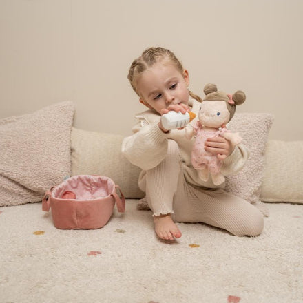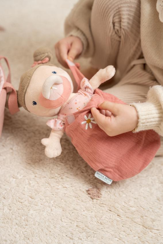 Maak kennis met kleine baby Rosa. Deze lieve pluche pop van Little Dutch wil graag geknuffeld en verzorgd worden. Zorgzame poppenmoeders en -vaders kunnen kleine Rosa de fles of de speen geven, een mutsje opzetten, de luier verschonen en lekker instoppen onder een dekentje. Ook kan zij makkelijk mee op reis in het schattige reismandje. Zo leren kinderen spelenderwijs een verzorgende rol op zich te nemen. Baby Rosa bewaart al hun geheimen en zal ze nooit aan iemand vertellen. Zij is heerlijk zacht om tegenaan te kruipen, wat kinderen een veilig gevoel geeft.