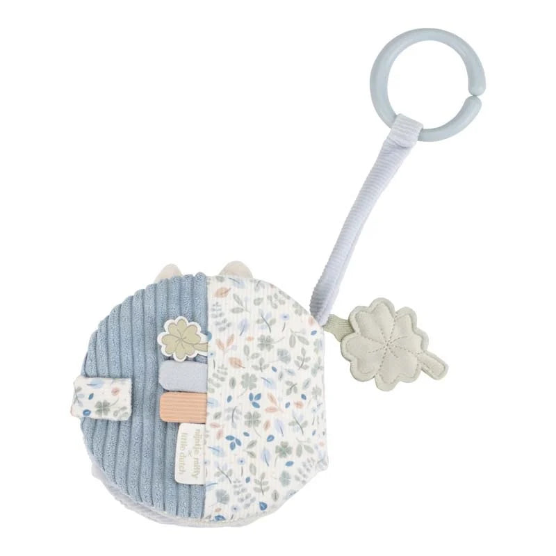 Een leuk buggyboekje gemaakt uit bio katoen met knisperend figuurtje, verschillende structuren en labeltjes. Gemakkelijk te bevestigen aan de buggy, kinderwagen of box.