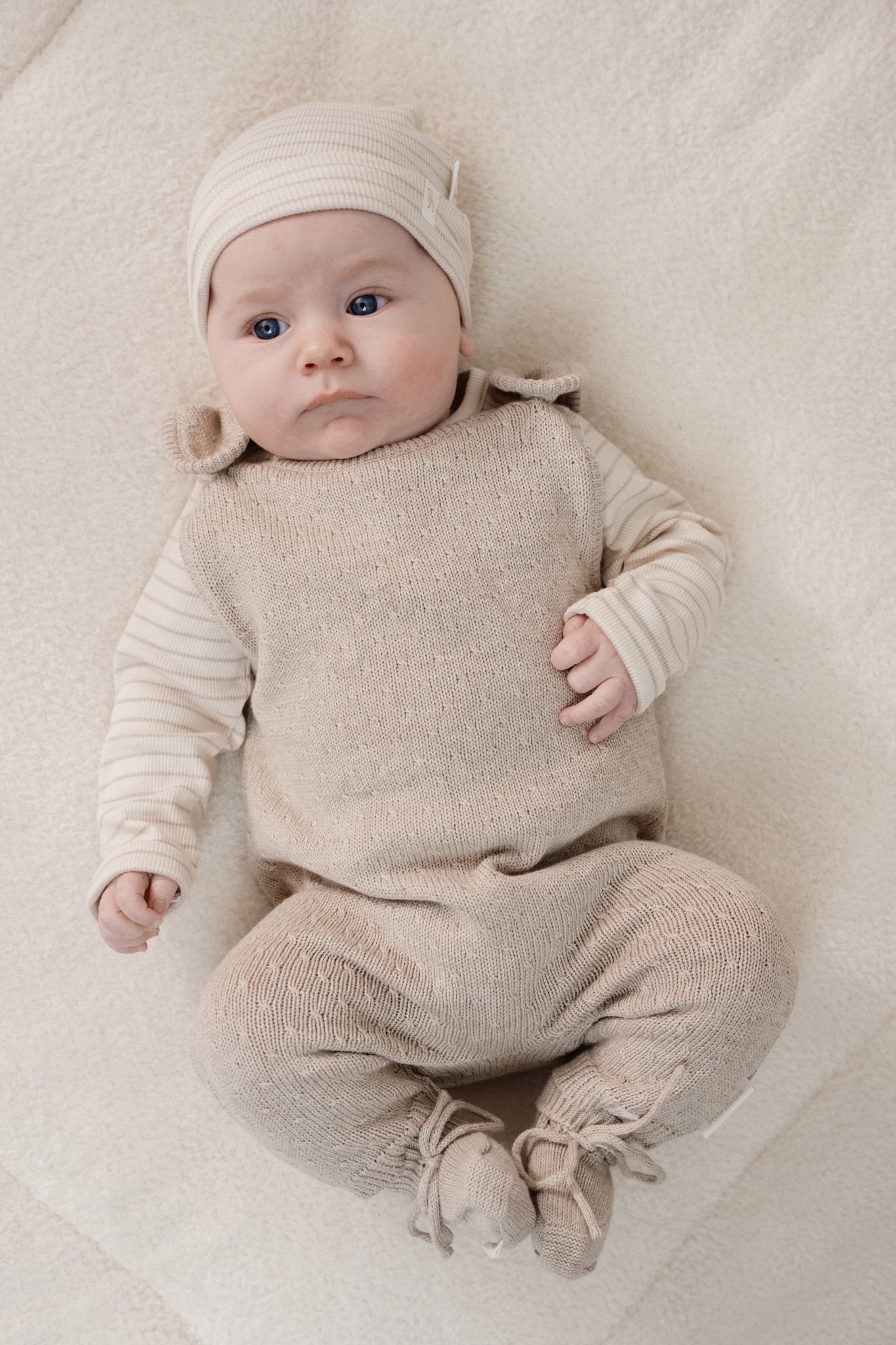 Cozy boxpakje in zand gemêleerd breisel met een speels stipjes-effect en stijlvolle hout-look knoopjes. Gemaakt van warm biologisch katoen en Oeko-Tex gecertificeerd: perfect te combineren met matching accessoires voor een knusse look met karakter!