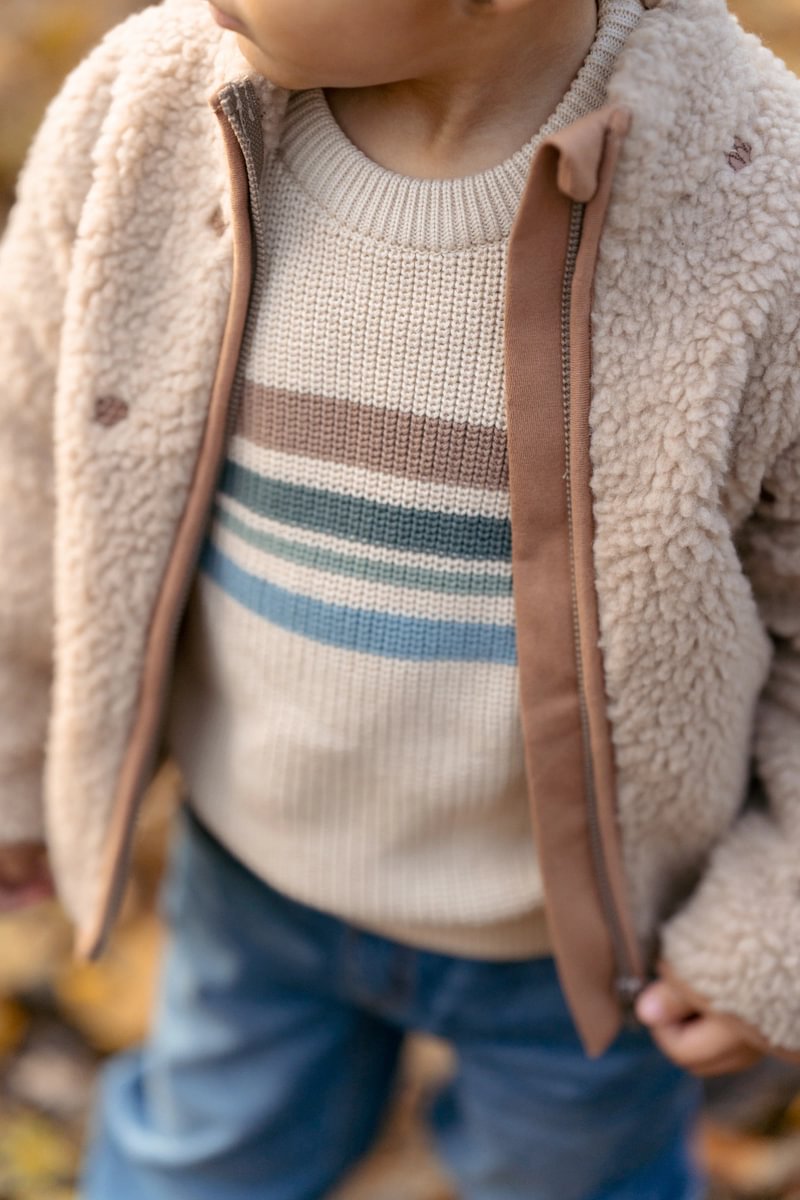 Warme gebreide trui, gekleurde strepen over de voorkant, achterkant om met alle kleuren broeken te combineren, gemaakt van biologisch katoen, Oekotex gecertificeerd.