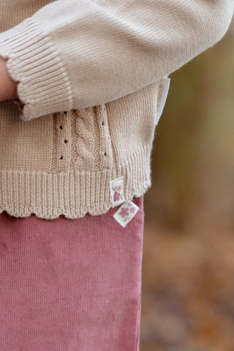 Gebreide trui met kabel detail, ruffle op de schouder, gemaakt van organisch katoen, Oekotex gecertificeerd.