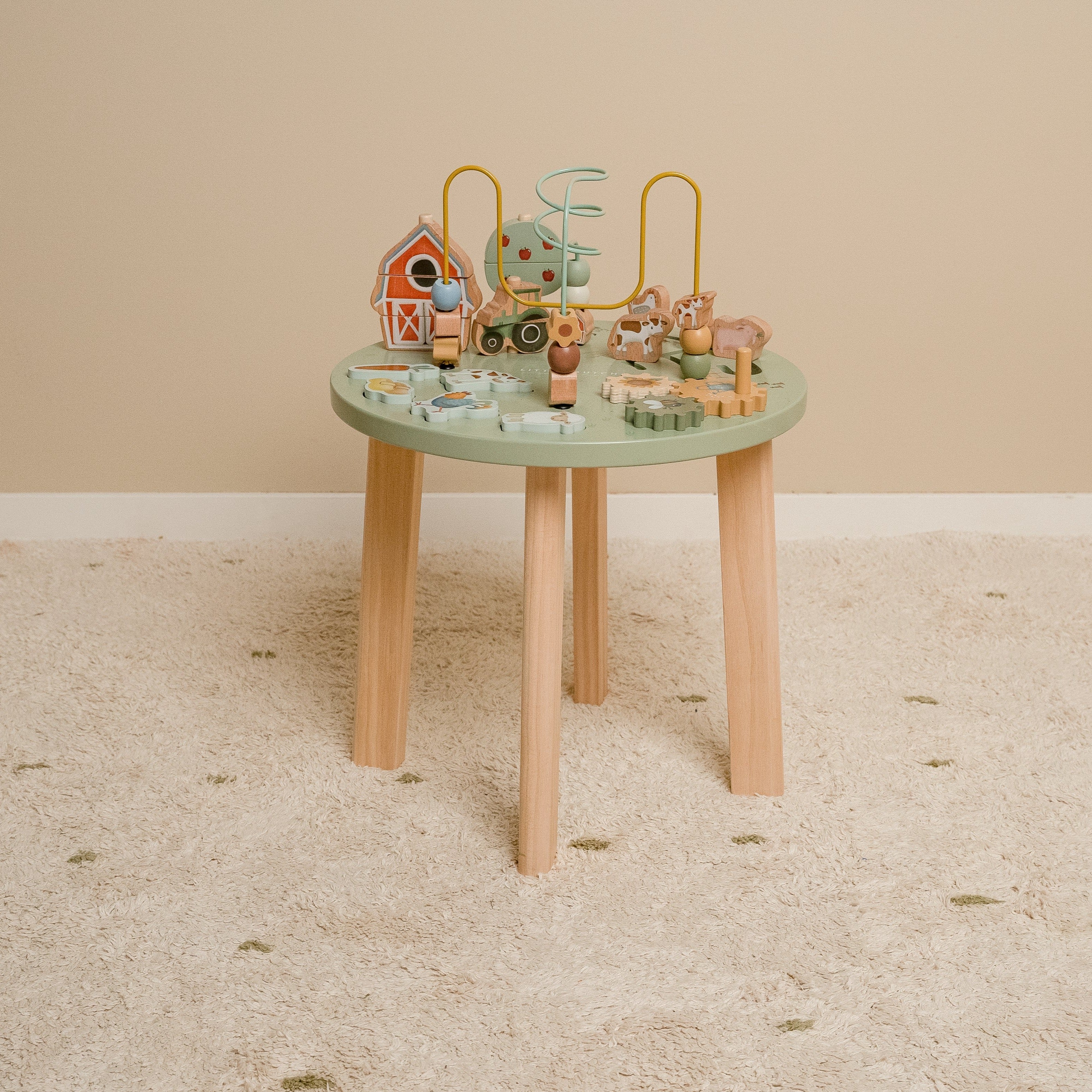 Sta op en speel! Ontdek alle activiteiten die deze tafel te bieden heeft. Breng de kralen van de ene naar de andere kant van de spiraal. Of bouw de boerderij. Maak de puzzel, draai aan de tandwielen en beweeg het schaapje, koetje en kipje. Deze houten activiteitentafel daagt je kleintje op vele manieren uit.