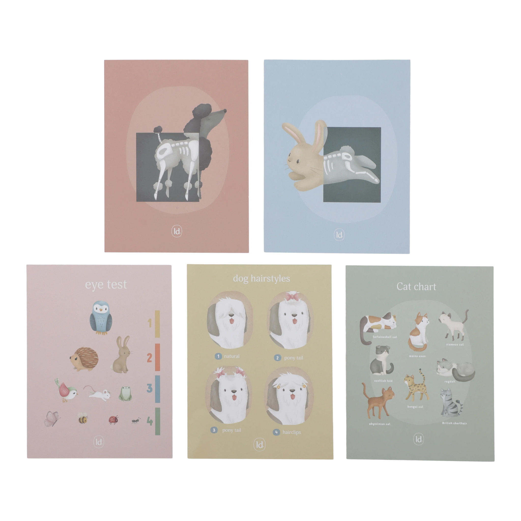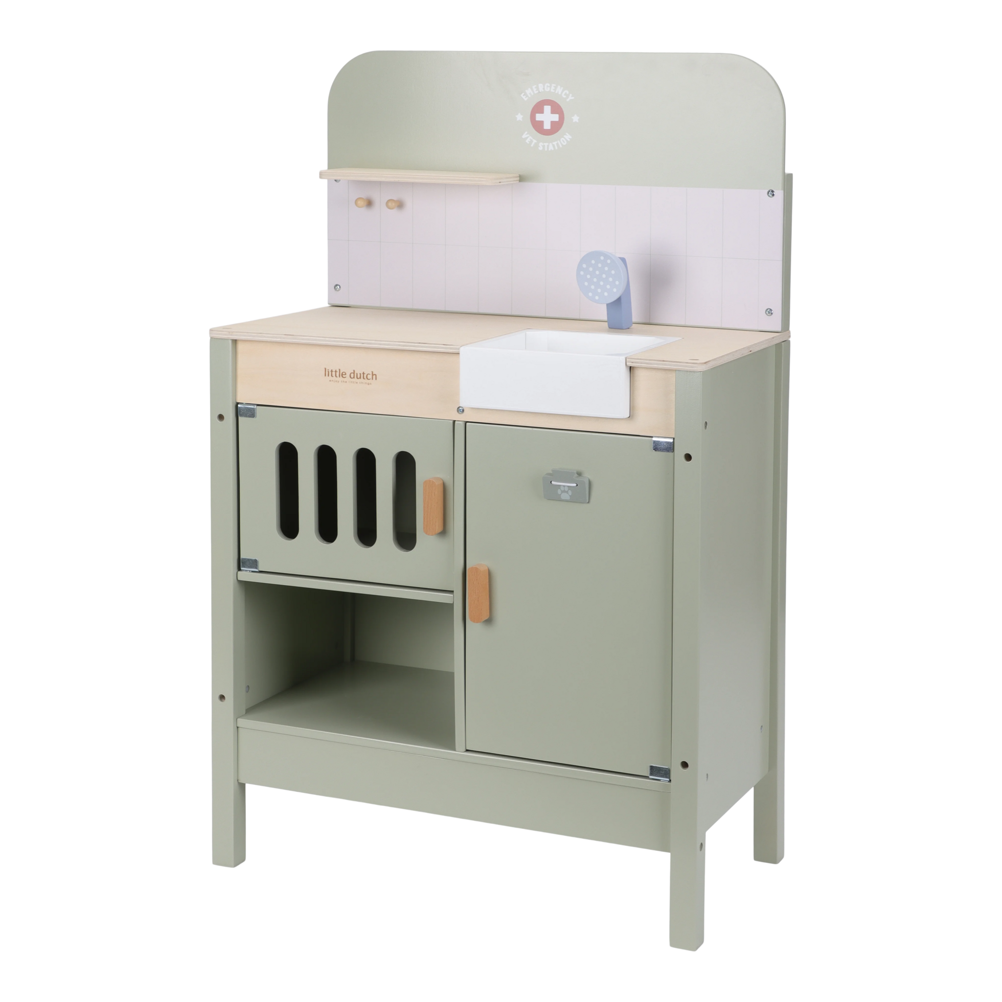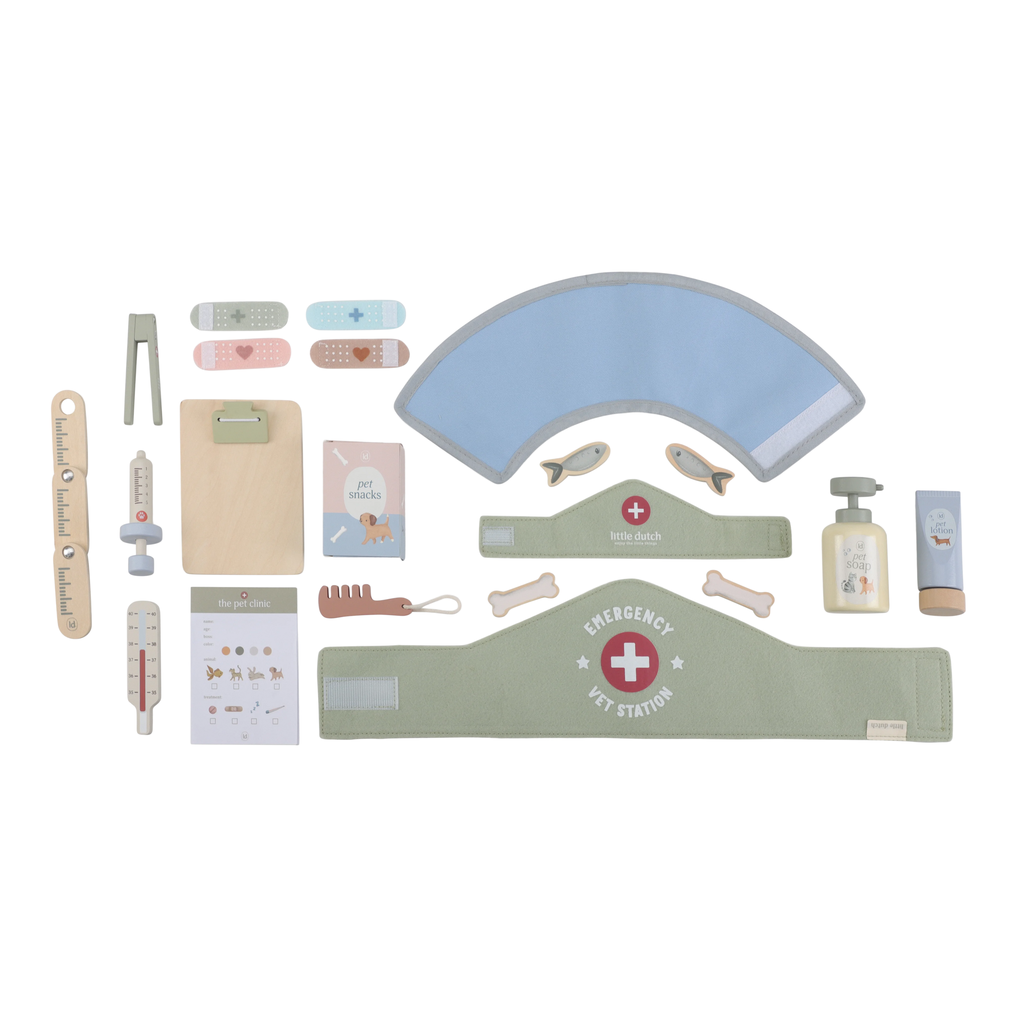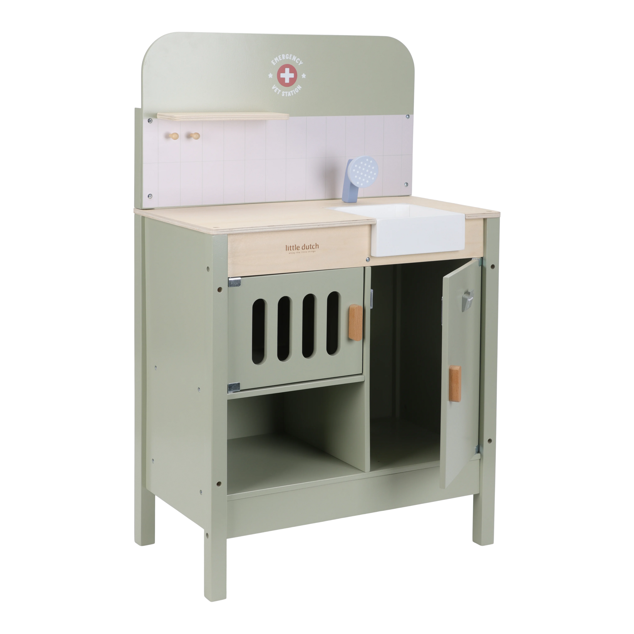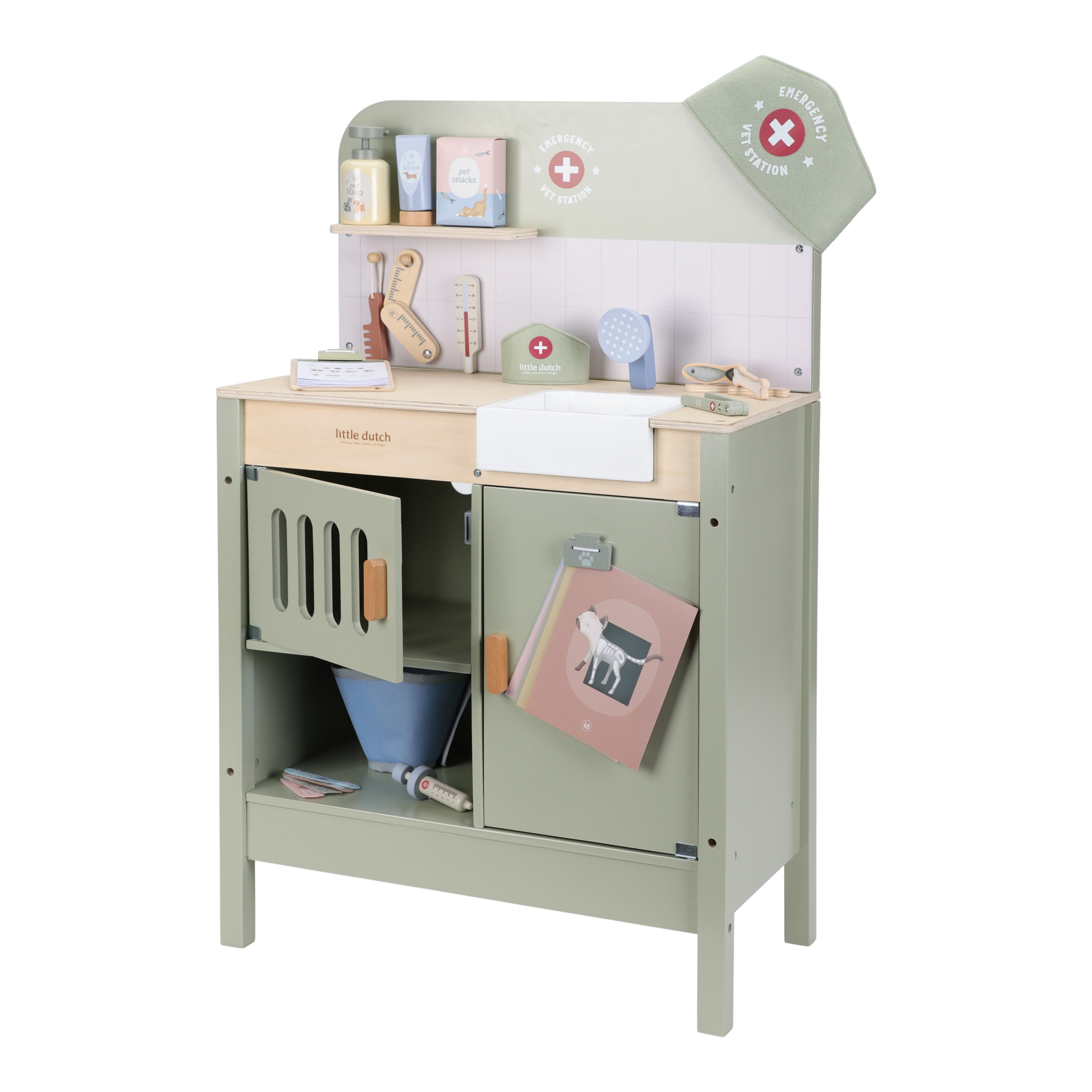 Zieke knuffels en zielige speelgoeddiertjes? Geen paniek! Onze kleine dierenarts staat paraat! Met deze uitgebreide houten dierenartspraktijk duikt je kleintje helemaal in de wereld van verzorging en fantasie.