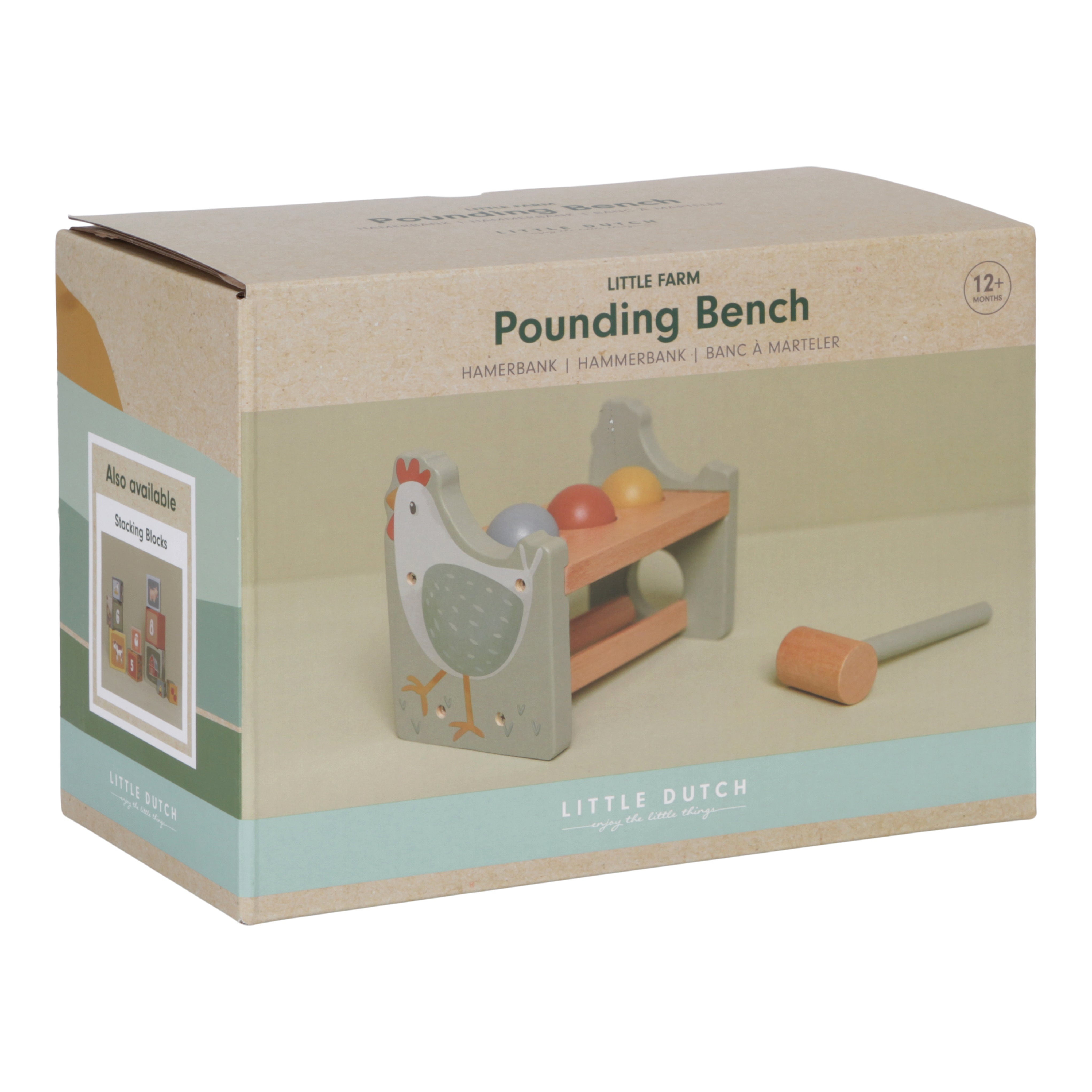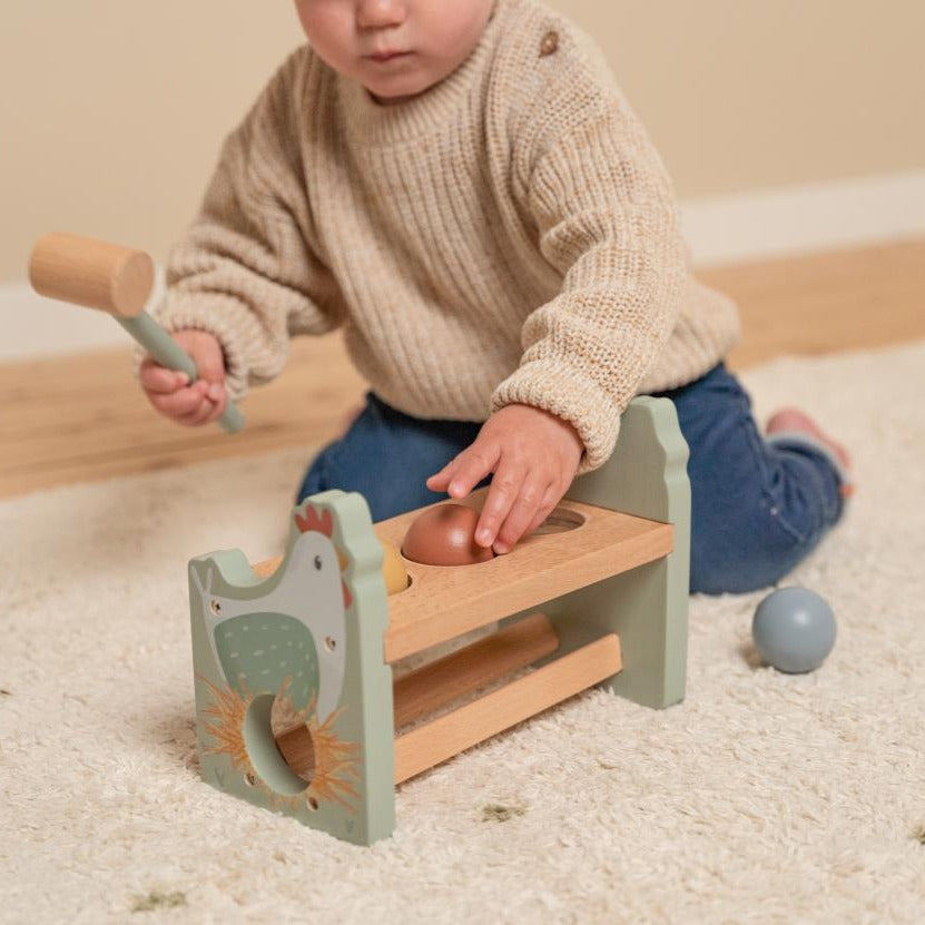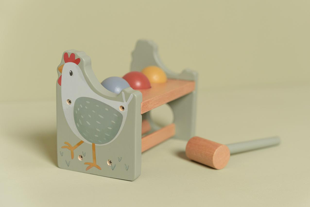 Tik tik tik! Laat de kip een ei leggen door met de hamer de 3 ballen in het houten hamerbankje te slaan. Dit een goede oefening voor de motoriek van je kindje. Zijn alle ballen erin geslagen? Leg de ballen weer terug en begin opnieuw. Hier zijn ze wel even zoet mee!
