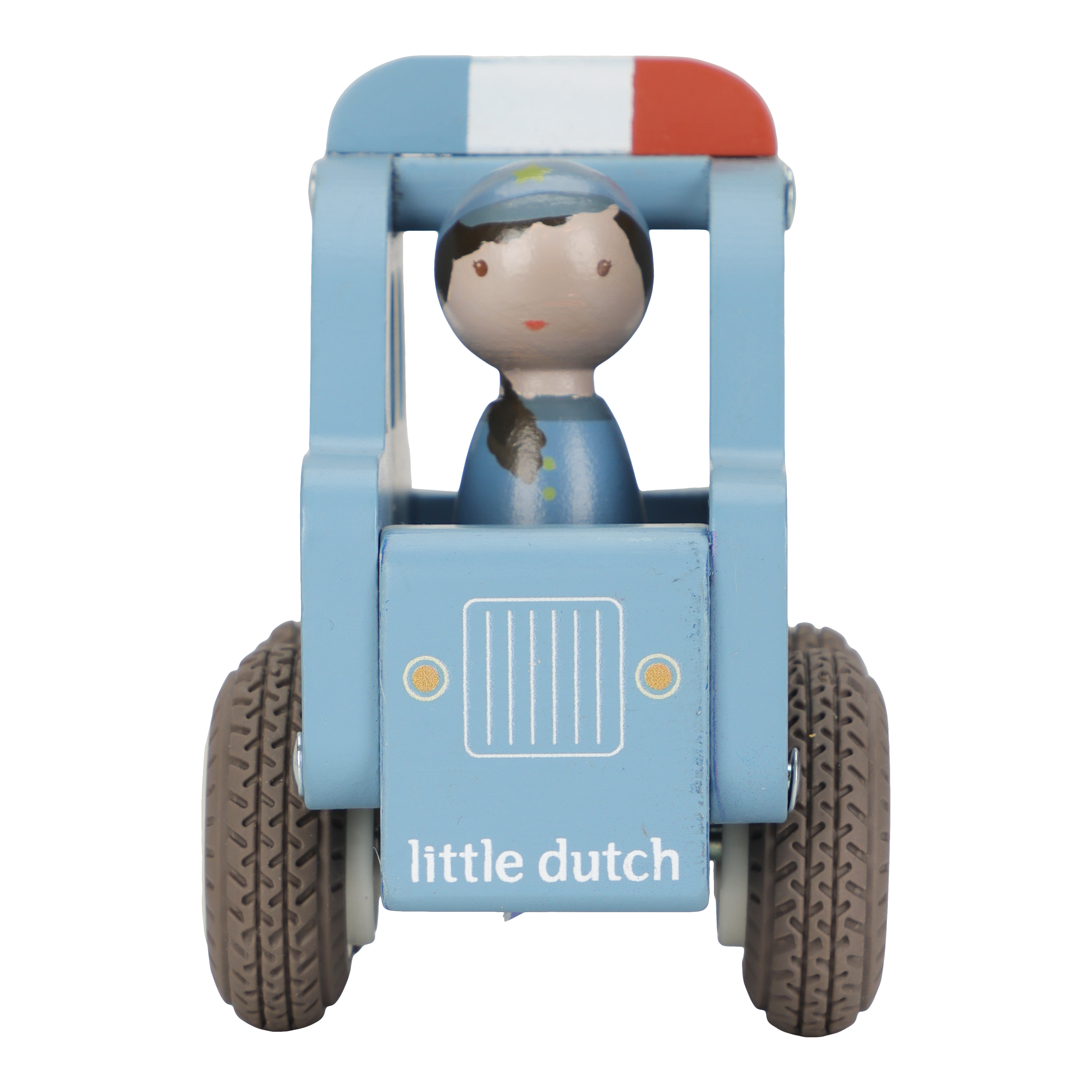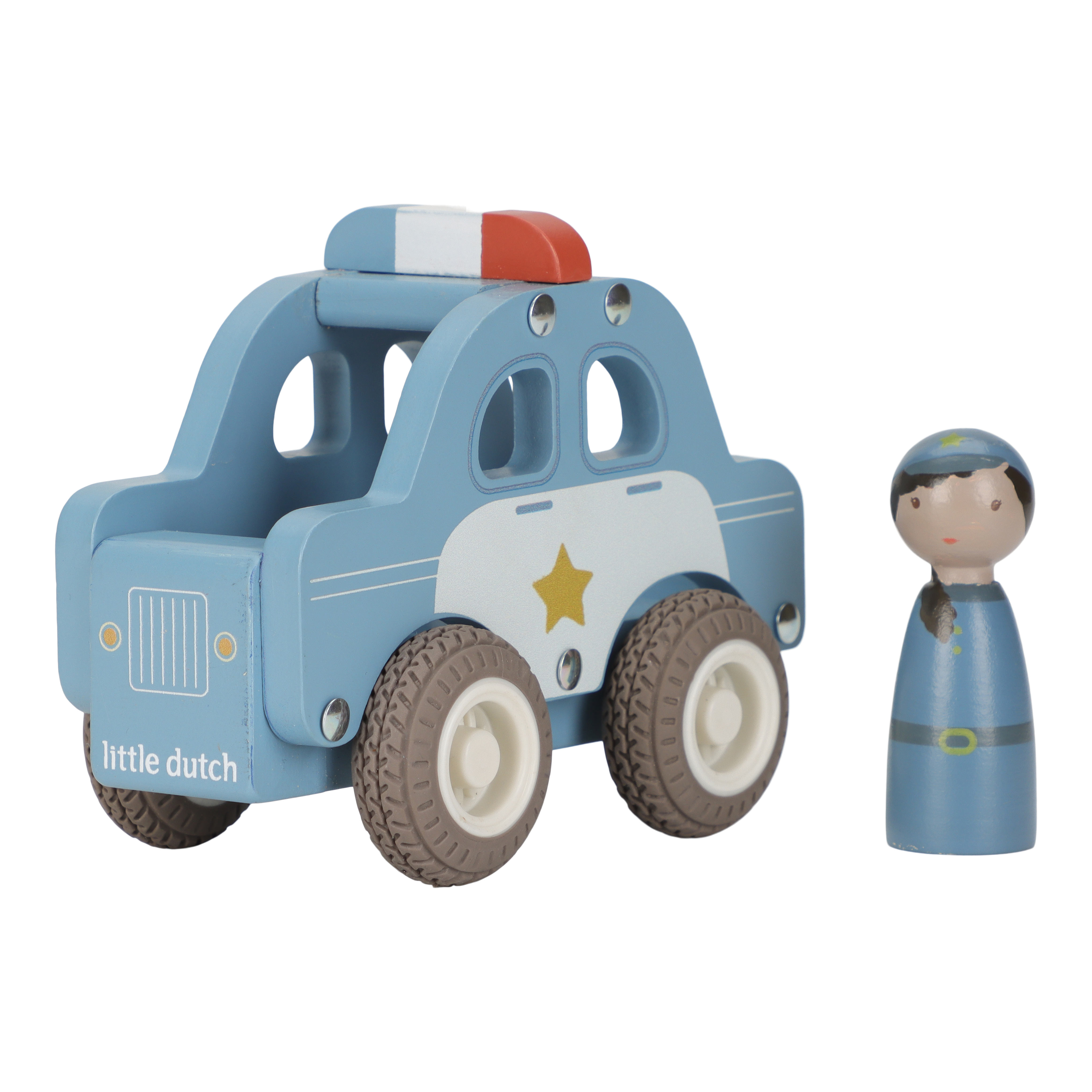 Noodgeval? De Little Dutch politiewagen is al onderweg! Komt inclusief houten poppetje en rubberen wieltjes voor rijdcomfort. Ontdek ook de andere leuke voertuigen uit deze reeks!