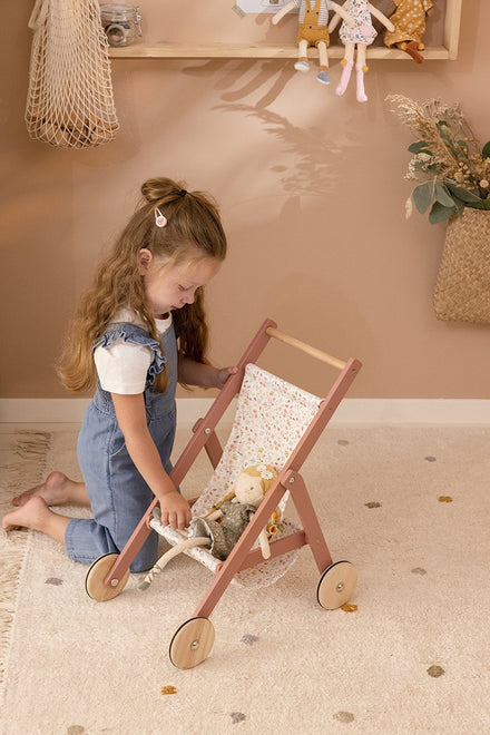 Samen met je popje of knuffels gaan wandelen met deze mooie, houten poppenbuggy van Little Dutch.