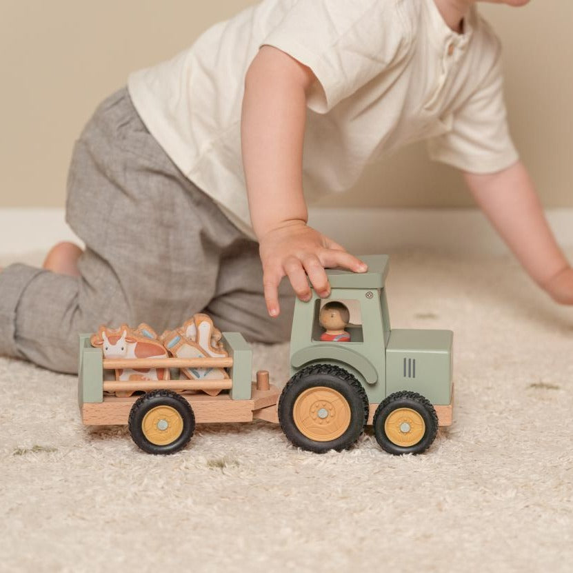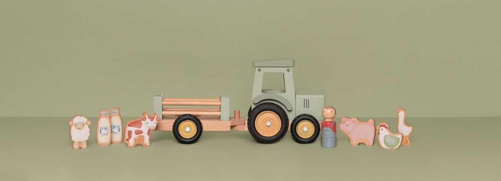 Vroem vroem, hier komt de tractor met alle diertjes aan! Super leuk speelgoed om de fantasie van jouw kleine te stimuleren. Naast de diertjes vind je ook twee melkflessen in de aanhangwagen. Breng alles naar de boerderij en je taak is voldaan. Alles is gemaakt van hout, waardoor het lang mee kan gaan.