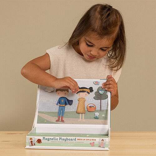 Een leuke dress up magneetset van Little Dutch. Ga je verkleden met Jim & Rosa! Met deze magnetische puzzel kan je de outfit die op het kaartje staat namaken met magnetische stukjes op het bord. Of gebruik je eigen fantasie. Er zijn eindeloze combinaties die speelplezier garanderen en de woordenschat en coördinatie aanmoedigen. Thuis, maar ook onderweg.