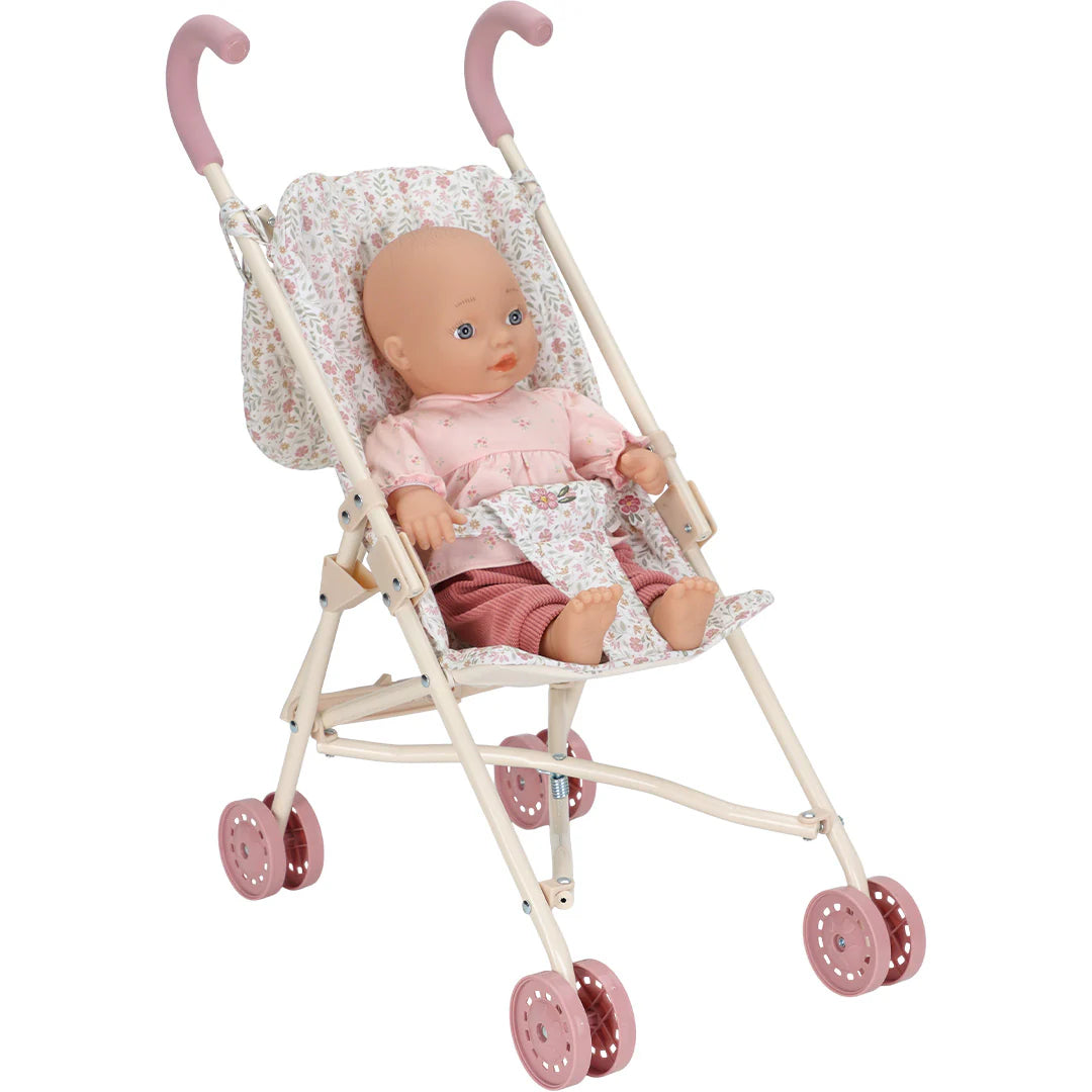 Praktisch en veilig: De buggy is voorzien van dubbele wielen voor extra stabiliteit en een veiligheidsriem om de pop of knuffel veilig op zijn plek te houden.