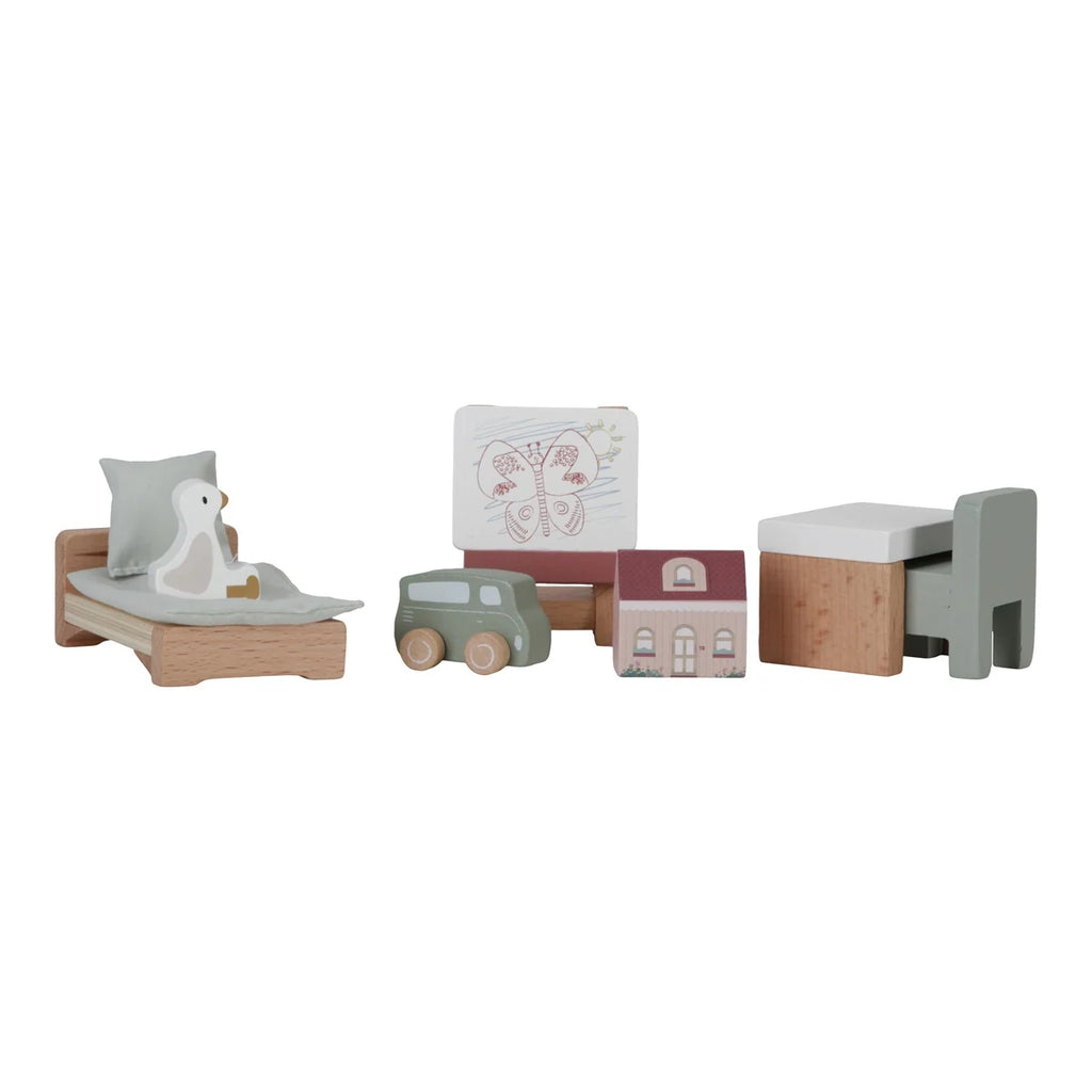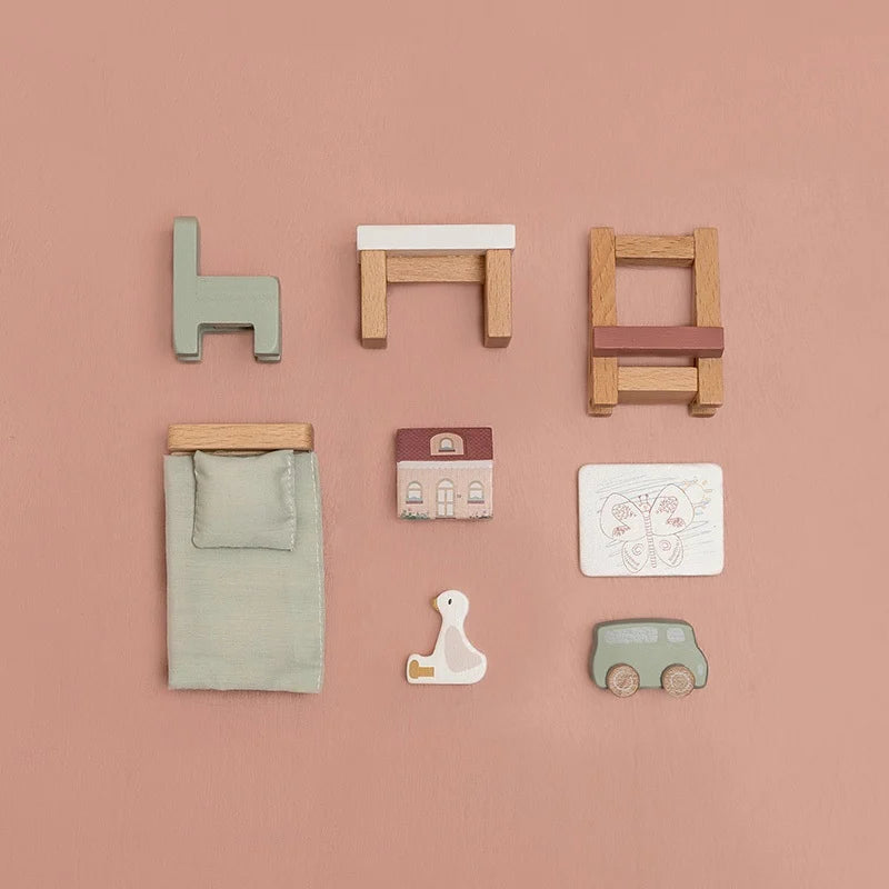 Deze poppenhuis speelset met meubeltjes voor de slaapkamer is de ideale aanvulling op je Little Dutch poppenhuis. De speelset bestaat uit leuke meubels en schattige accessoires voor nog meer speelplezier. Dit pakket wordt geleverd inclusief stickers om het huis helemaal in je eigen stijl aan te kleden.