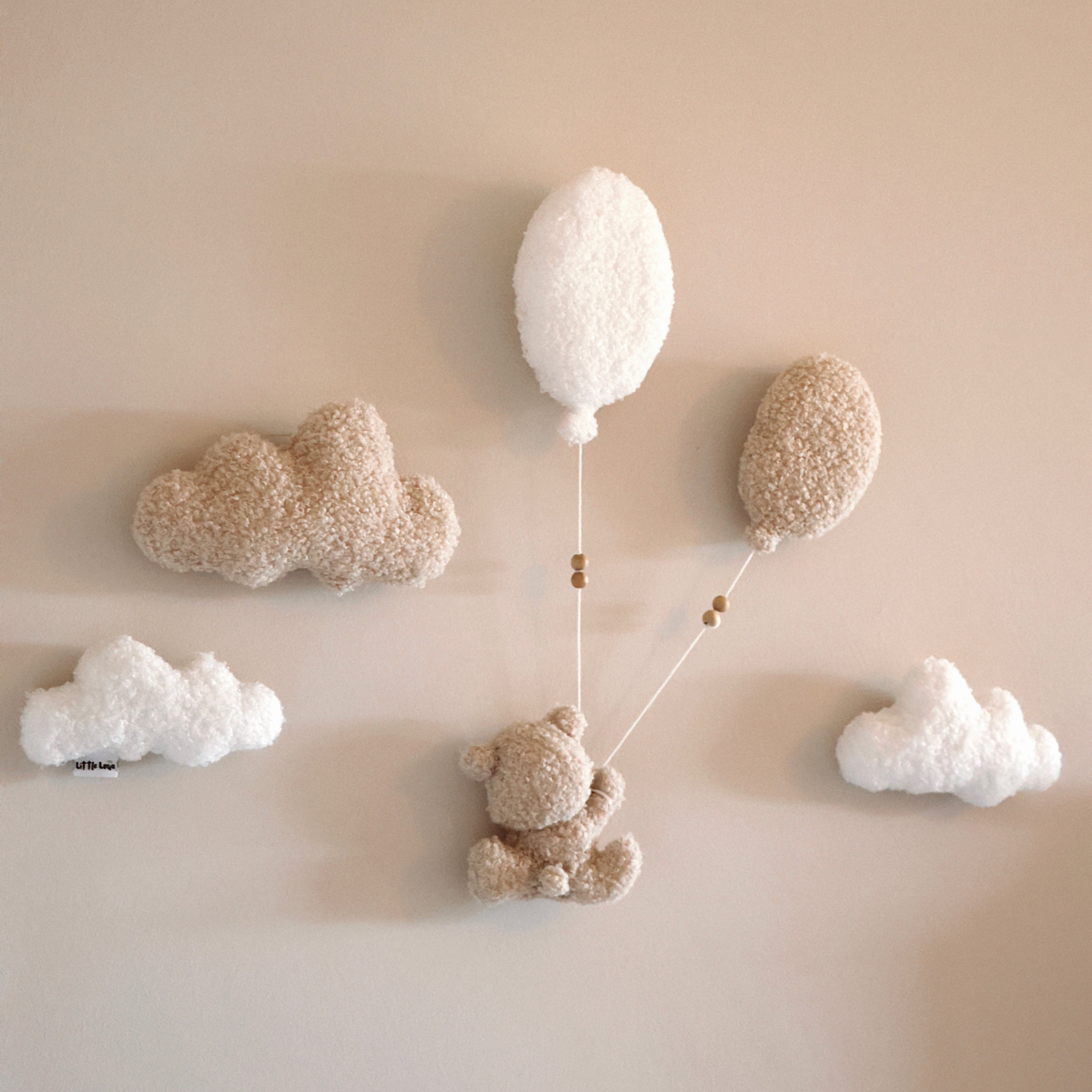 De muurdecoratie bestaat uit 3 zachte wolken, een teddybeer en 2 ballonnen.