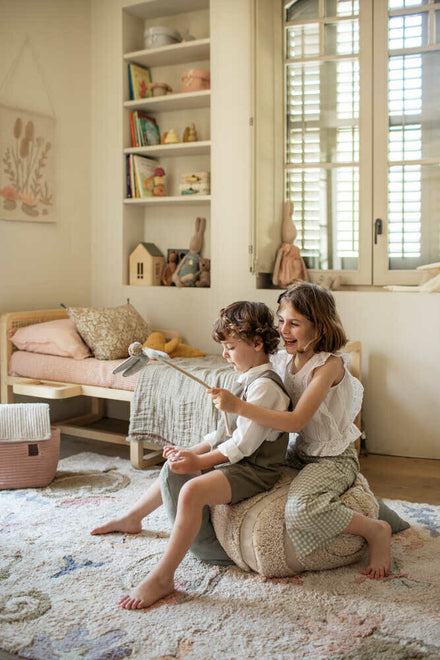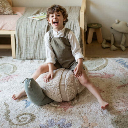 Deze Mr. Slak poef is een elegant decorstuk dat zelfs in de woonkamer of een andere ruimte in huis kan worden geplaatst voor het plezier van de kleintjes. Hij is handgemaakt in Vintage Blue katoenen canvas gecombineerd met een natuurlijk semi-getuft doek dat het patroon van de schelp bepaalt. Hij is gevuld met polystyreenparels en heeft met de hand gevlochten oogstengels. De vulling is afneembaar via een rits om te wassen.