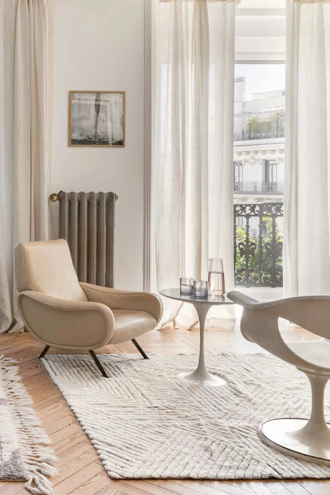 Het gelijkmatige ontwerp, in het natuurlijke beige van de katoenvezel zelf, combineert verschillende poolhoogtes en meerdere stiktechnieken - gesneden pool, lus en chenille - om een afwerking met gemengde textuur te bereiken, terwijl de ongelijke contour een organische uitstraling geeft aan de rechthoekige vorm.