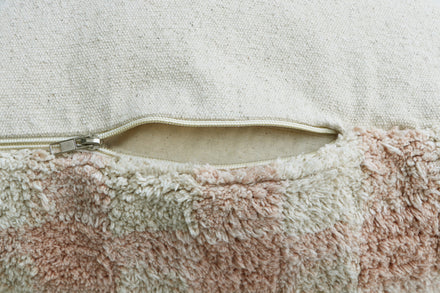 De pouffe heeft een ritssluiting waardoor je de hoes kan afnemen en gemakkelijk kan wassen op 30°C op delicaat programma.